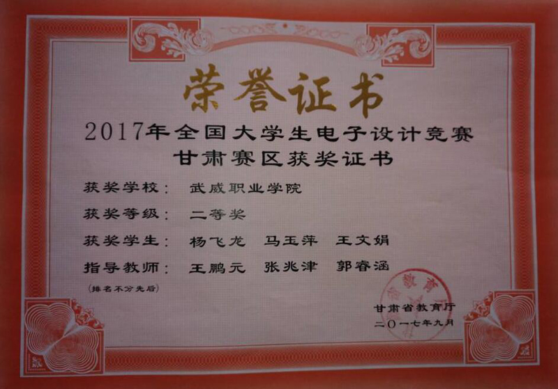 近日,2017年全國大學(xué)生電子設(shè)計(jì)競(jìng)賽甘肅賽區(qū)成績揭曉。由電子信息工程系2016級(jí)應(yīng)用電子技術(shù)專業(yè)楊飛龍、馬玉萍、王文娟3名同學(xué)組成的團(tuán)隊(duì)在我系王鵬元、張兆津、郭睿涵3名教師指導(dǎo)下榮獲甘肅賽區(qū)二等獎(jiǎng)。此次獲獎(jiǎng)也是我系在優(yōu)質(zhì)校建設(shè)中狠抓教學(xué)科研和學(xué)生技能培養(yǎng)方面取得的豐碩成果。