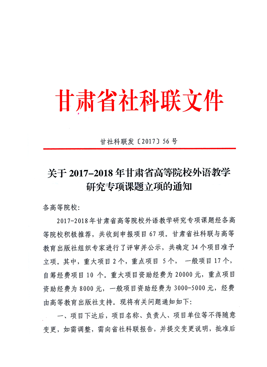 轉(zhuǎn)發(fā)甘肅省社科聯(lián)“關(guān)于2017-2018年甘肅省高等院校外語(yǔ)教學(xué)研究專(zhuān)項(xiàng)課題立項(xiàng)的通知”