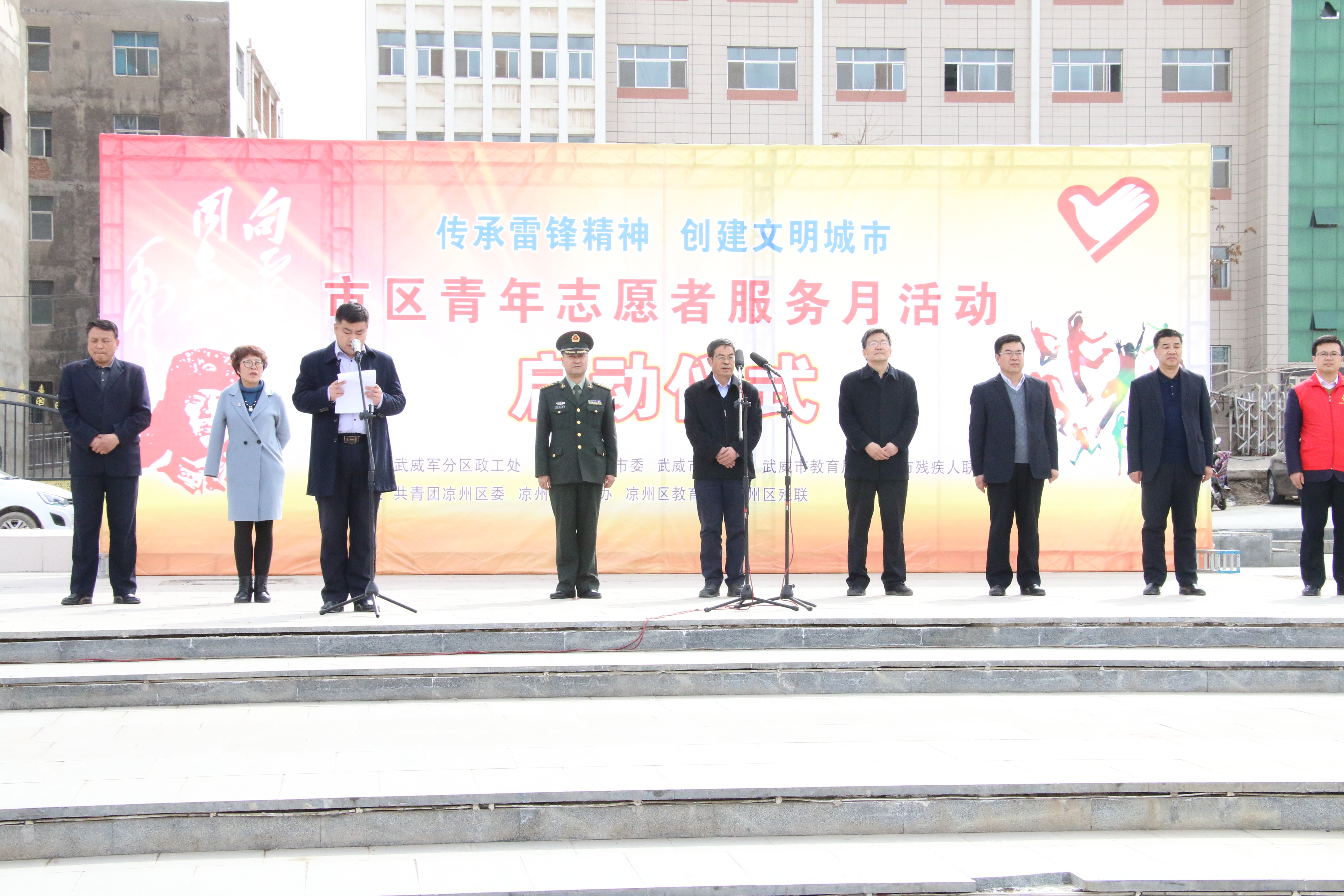 今年是毛澤東等老一輩革命家為雷鋒同志題詞55周年,3月5日是中國青年志愿者服務(wù)日。 3月5日下午,學(xué)院50名志愿者在武威市文化廣場參加了全市志愿者服務(wù)月活動(dòng)啟動(dòng)儀式,活動(dòng)現(xiàn)場氣氛熱烈,市領(lǐng)導(dǎo)為我院志愿服務(wù)隊(duì)進(jìn)行了授旗,青年志愿者代表宣讀了倡議書,全體志愿者重溫了青年志愿者誓詞。