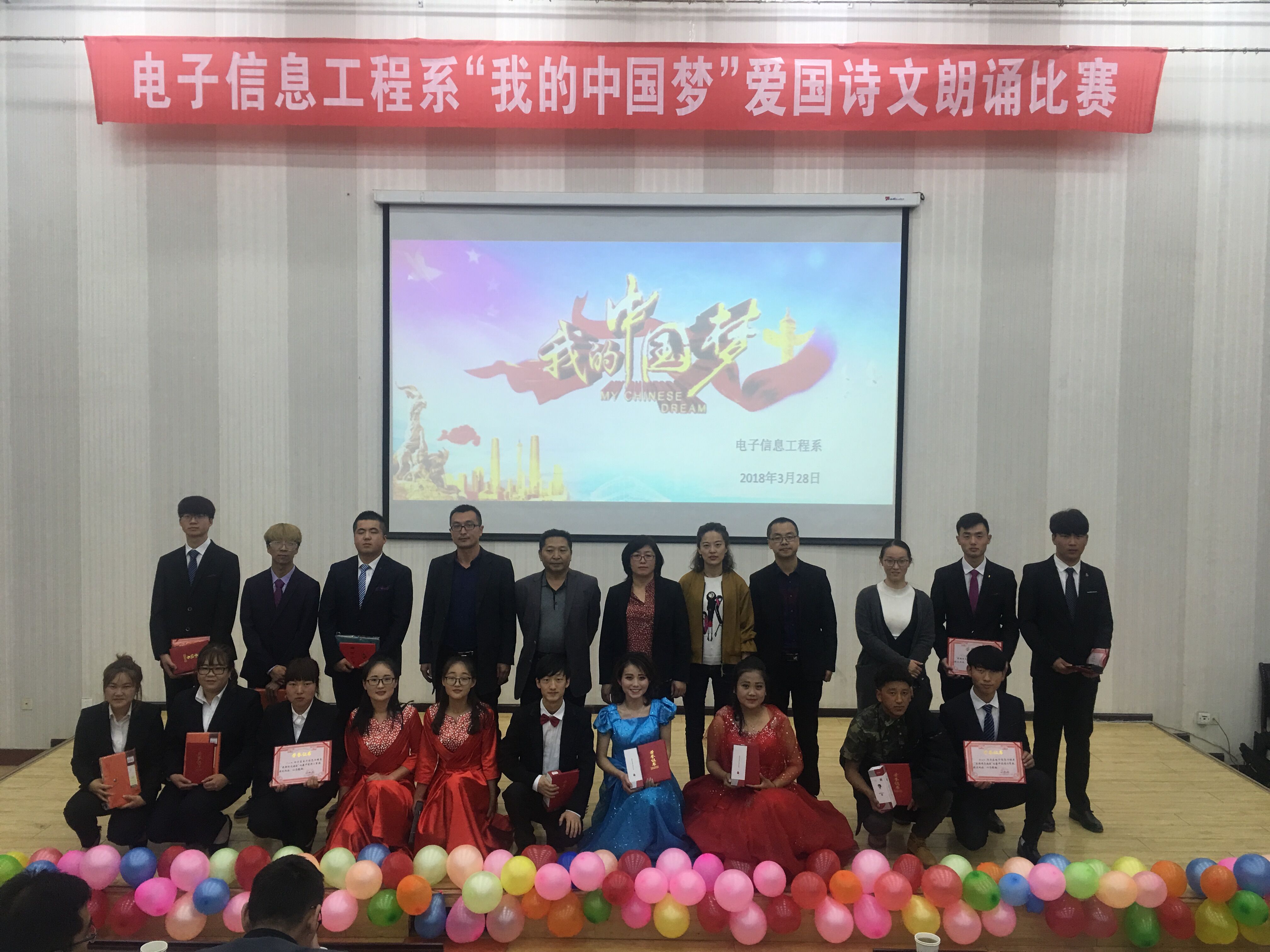 ? ? 為進(jìn)一步弘揚和培育社會主義核心價值觀,引導(dǎo)學(xué)生實現(xiàn)國家富強、民族復(fù)興的偉大“中國夢”而發(fā)憤圖強、勇?lián)厝危?/span>激勵學(xué)生通過誦讀經(jīng)典來繼承傳統(tǒng),增強學(xué)生的愛國情感。3月28日,電子信息工程系在正德廳舉辦了“我的中國夢”愛國詩文朗誦比賽。電子信息工程系黨總支書記袁青年、系主任李亞梅、全體班主任及學(xué)生觀看了比賽。