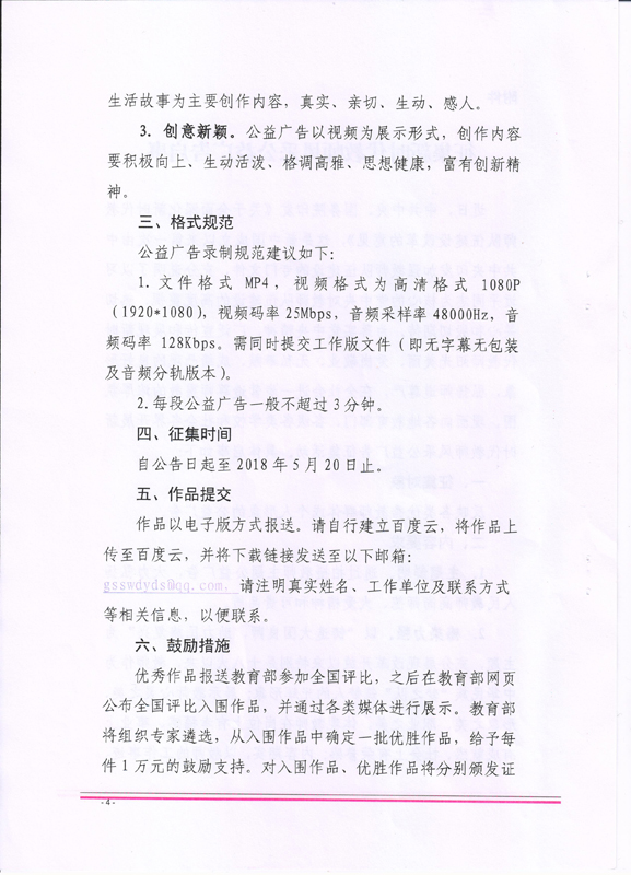 ???? 現(xiàn)將甘肅省教育廳《甘肅省教育廳關(guān)于做好征集新時代教師風(fēng)采公益廣告有關(guān)工作的通知》(甘教師函〔2018〕24號)轉(zhuǎn)發(fā)你們,請各部門、單位根據(jù)通知要求認(rèn)真組織,積極參與。將參賽作品于5月15日前報宣傳統(tǒng)戰(zhàn)部辦公室,宣傳統(tǒng)戰(zhàn)部對報送作品匯總后統(tǒng)一報送省教育廳電教中心。