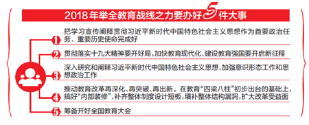 陳寶生在會議總結(jié)講話中強調(diào),新的一年,教育戰(zhàn)線要把握穩(wěn)中求進的總基調(diào)、狠抓落實的總基點、攻堅克難的總要求、“奮進之筆”的總抓手,舉全教育戰(zhàn)線之力辦好幾件大事。一是把學習宣傳闡釋貫徹習近平新時代中國特色社會主義思想作為首要政治任務、重要歷史使命完成好。二是貫徹落實十九大精神要開好局,加快教育現(xiàn)代化、建設教育強國要開啟新征程。三是深入研究和闡釋習近平新時代中國特色社會主義思想,加強意識形態(tài)工作和思想政治工作。四是推動教育改革再深化、再突破、再出新。在教育“四梁八柱”初步出臺的基礎上,搞好“內(nèi)部裝修”,補齊整體制度設計短板,填補整體結(jié)構(gòu)漏洞,擴大改革受益面。五是籌備開好全國教育大會。