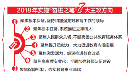 陳寶生指出,黨的十九大對教育工作作出了全面系統(tǒng)部署。在加快教育現(xiàn)代化、建設教育強國的新征程中,解決教育發(fā)展不平衡不充分的問題將是我們長期要面對的工作主題。要以問題為導向,將其作為實施“奮進之筆”的著力點和主攻方向。一是聚焦根本保證,堅持和加強黨對教育工作的領(lǐng)導。要把黨的政治建設擺在首位,狠抓大抓基層黨組織建設,持之以恒正風肅紀,抓好意識形態(tài)工作。二是聚焦根本任務,系統(tǒng)推進立德樹人。要把德育擺在更加重要的位置,堅定青少年理想信念,改進和加強思想政治工作,大力發(fā)展素質(zhì)教育,加強語言文字工作。三是聚焦人民群眾關(guān)切,不斷完善公共教育服務體系。要促進學前教育普惠健康發(fā)展,加快城鄉(xiāng)義務教育一體化發(fā)展步伐,加大普及高中階段教育攻堅力度,加大對困難地區(qū)扶持力度,切實加強校園安全。四是聚焦提升貢獻力,大力促進教育內(nèi)涵發(fā)展。要以質(zhì)量為本,持續(xù)推進職業(yè)教育質(zhì)量提升,健全高等教育內(nèi)涵發(fā)展政策機制,辦好繼續(xù)教育。五是聚焦激發(fā)活力,縱深推進教育改革。要深化“放管服”改革,實施考招改革“拓展深化”攻堅行動,支持和規(guī)范社會力量興辦教育,堅定不移以開放促改革。六是聚焦高素質(zhì)專業(yè)化,全面加強教師隊伍建設。實施教師隊伍“建設改革”攻堅行動,健全師德師風建設長效機制,完善教師管理制度,提升教師獲得感、幸福感和榮譽感。七是聚焦保障機制,夯實教育事業(yè)基礎。要落實教育投入責任,加快教育信息化步伐,全力推進依法治教。