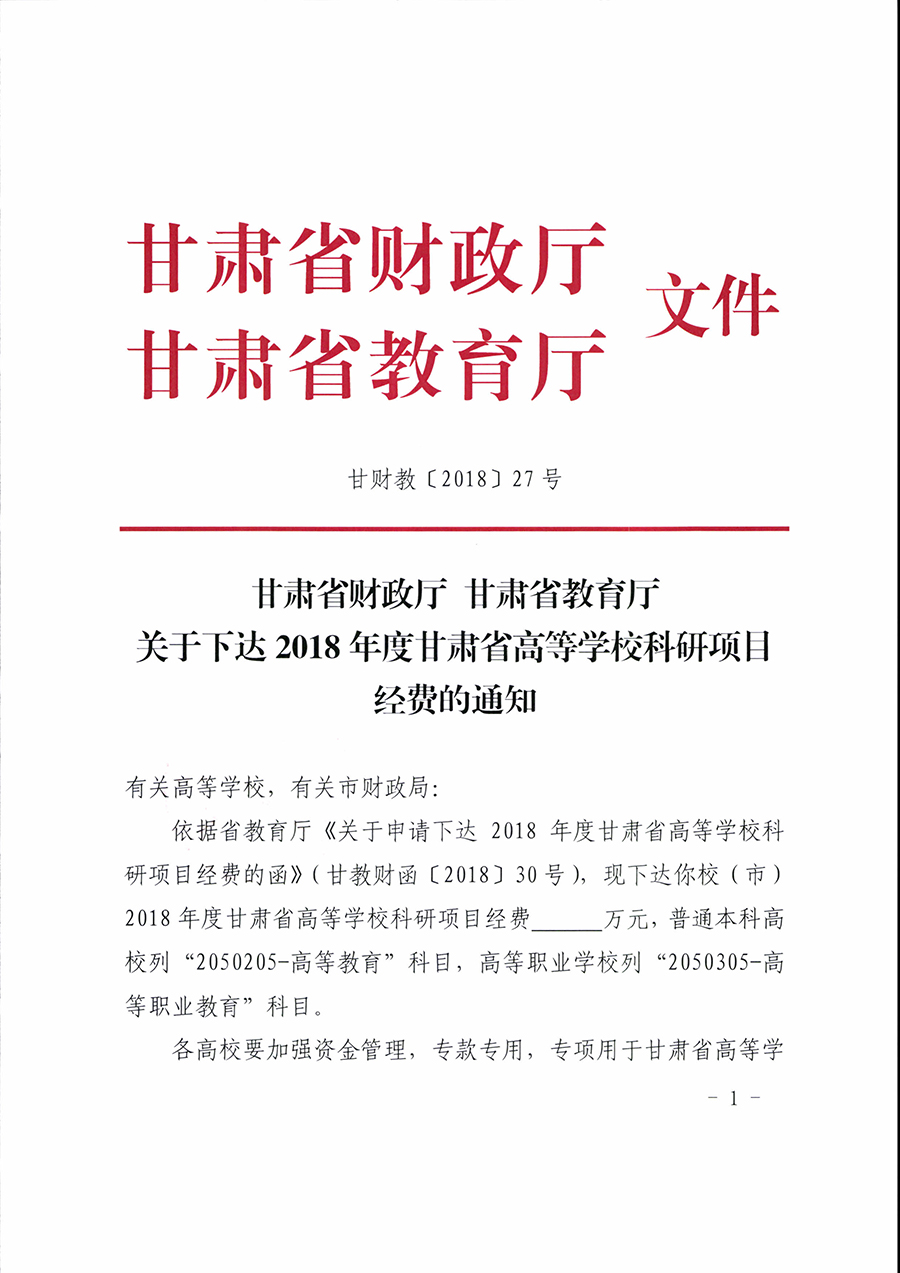 甘肅省財政廳 甘肅省教育廳關(guān)于下達2018年度甘肅省高等學(xué)??蒲许椖拷?jīng)費的通知.rar