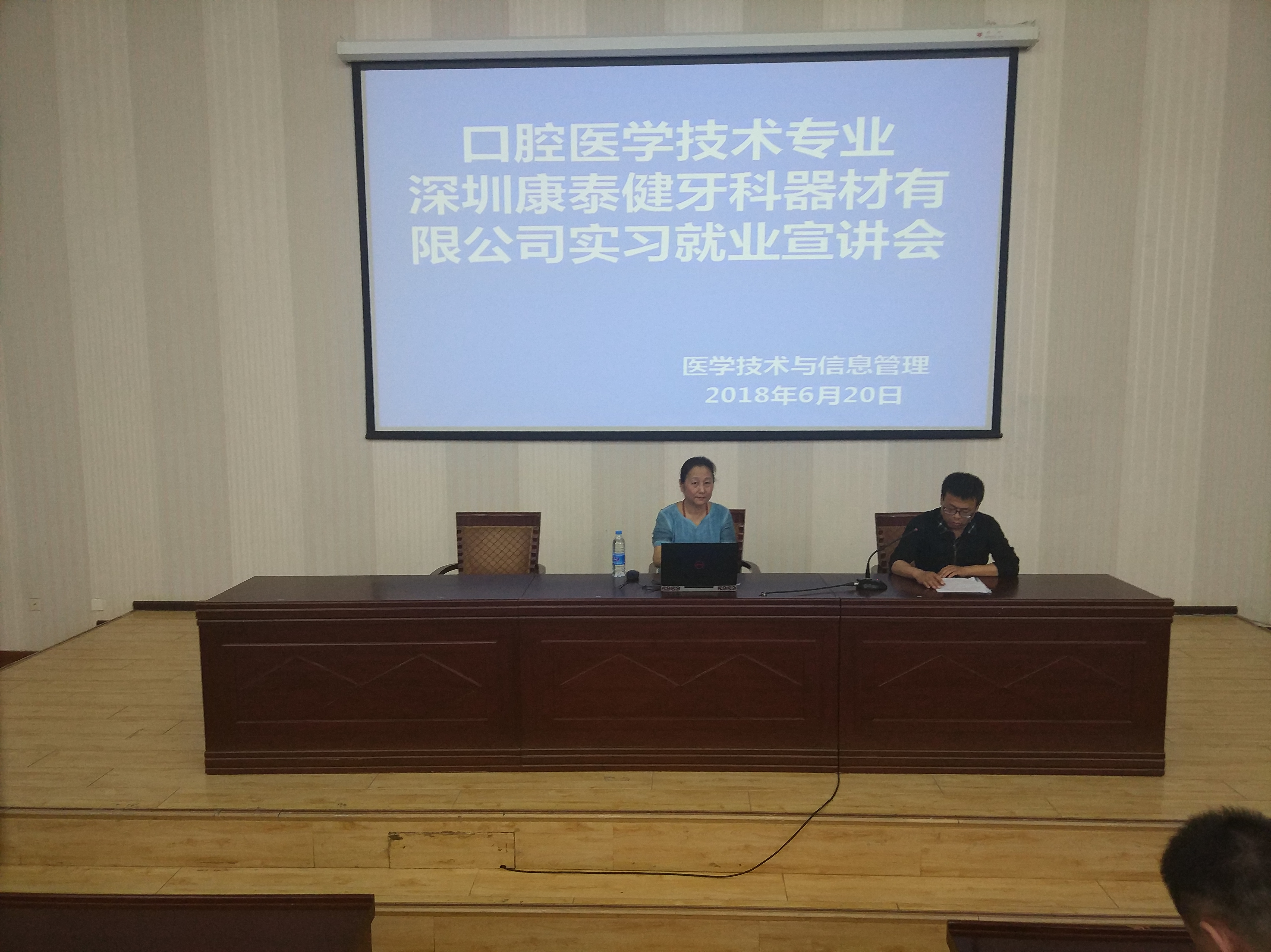 6月20日,醫(yī)學技術學院邀請深圳市康泰健牙科器材有限公司在正德廳召開企業(yè)實習就業(yè)宣講。參加宣講會的有康泰健牙科器材有限公司培訓學校校長辛金紅、口腔技術專業(yè)教研室全體老師、在校口腔醫(yī)學技術專業(yè)學生,宣講會由系副主任蔡濟眾主持。