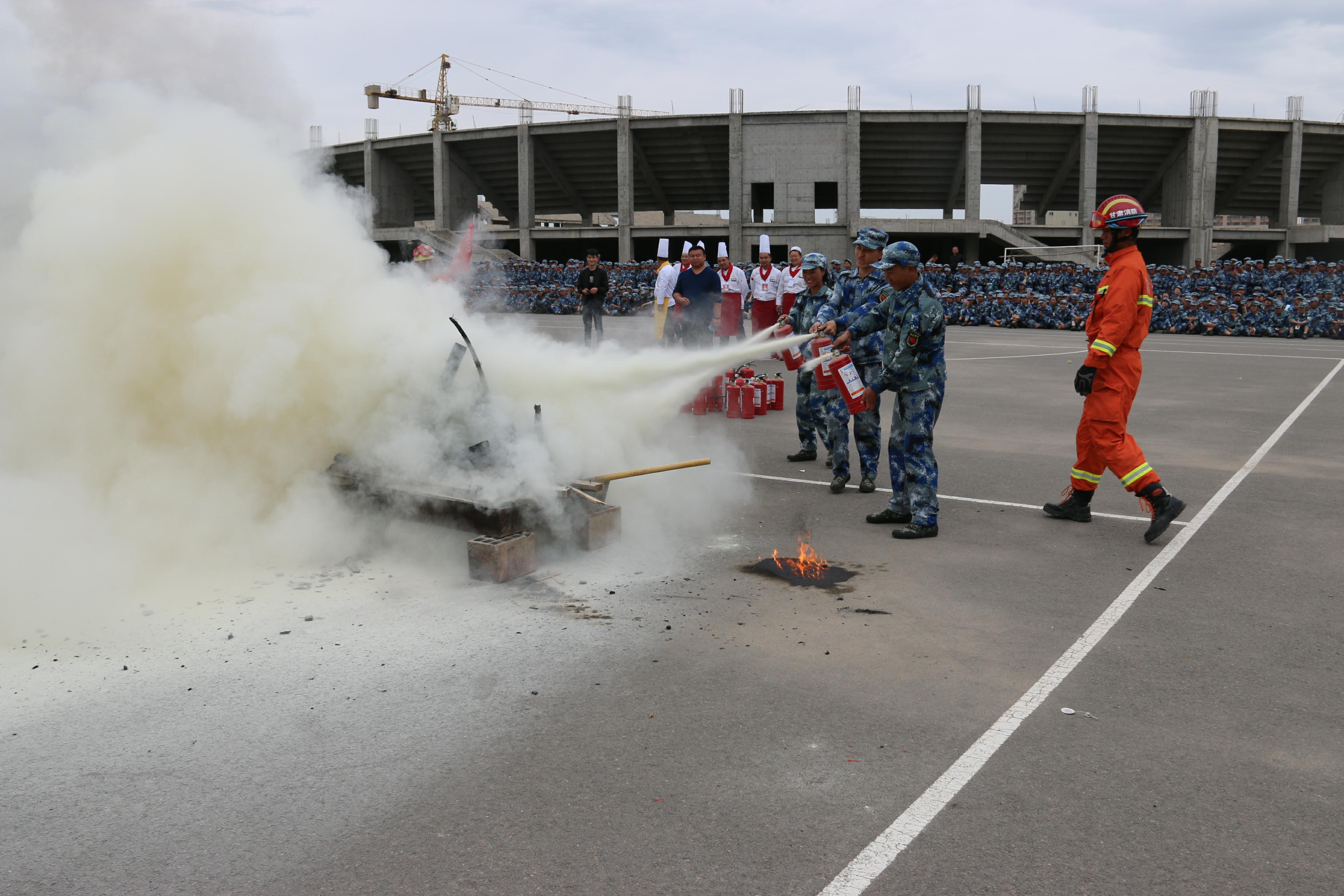 隨后,所有參演學(xué)生整隊(duì)到操場參加了滅火演練。在消防官兵的講解和和示范下,同學(xué)們體驗(yàn)了處置著火液化氣瓶、干粉滅火器滅火、穿消防救生衣、通過模擬煙室等操作。