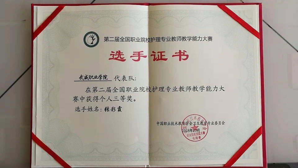 競賽共分為理論考核、說課程和臨床護理技能操作三個部分。其中,臨床護理技能操作部又分為三項,心肺復蘇術和靜脈輸液操作技術為必選項目,置胃管技術和氣管切開護理技術為抽選項目。經(jīng)過三天緊張激烈的比拼,通過了全部考核內(nèi)容的綜合評定,最終張彩霞老師獲得了三等獎。