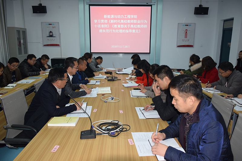 11月28日下午,新能源與動(dòng)力工程學(xué)院召開(kāi)全體教職工會(huì)議,在明德樓409集中學(xué)習(xí)《新時(shí)代高校教師職業(yè)行為十項(xiàng)準(zhǔn)則》。新能源與動(dòng)力工程學(xué)院辦公室主任任陶領(lǐng)學(xué),與會(huì)人員重點(diǎn)圍繞《準(zhǔn)則》談了學(xué)習(xí)體會(huì)。