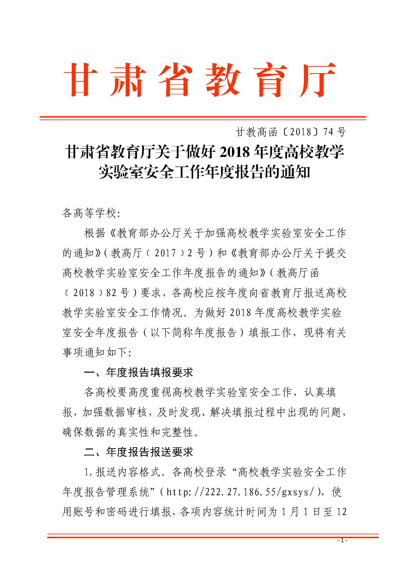甘肅省教育廳關(guān)于做好2018年度高校教學(xué)實驗室安全工作年度報告的通知