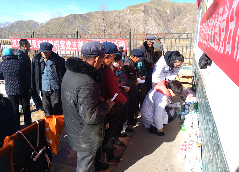 到達(dá)目的地后,黨員們不顧辛勞,分成兩組,一組由護(hù)理系黨總支書記張建輝帶領(lǐng)前往臥病在床的扶貧對(duì)象家里,親切詢問病情及家里近況,送上常備藥品。另一組在當(dāng)?shù)卮宀窟M(jìn)行義診活動(dòng),醫(yī)護(hù)人員仔細(xì)給村民們進(jìn)行體檢,耐心解答、細(xì)心診治;對(duì)前來問診的村民認(rèn)真進(jìn)行血壓、血糖、丙肝等項(xiàng)目的檢測(cè)、免費(fèi)發(fā)放藥品并對(duì)糖尿病、高血壓等慢性病的飲食、活動(dòng)和用藥進(jìn)行指導(dǎo),普及衛(wèi)生常識(shí)和健康知識(shí)。醫(yī)護(hù)人員的精心服務(wù)讓村民們倍感欣慰,受到了他們的熱烈歡迎和一致稱贊。