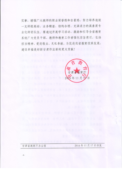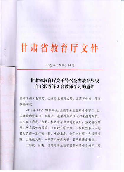 現(xiàn)將《甘肅省教育廳關于號召全省教育戰(zhàn)線向王彩霞等3名教師學習的通知》復印給你們,請認真組織所屬教職工學習王彩霞、徐菊 、楊玲3名教師愛崗敬業(yè)、無私奉獻、愛心救人的先進事跡。積極在院團委、系團總支,輔導員和班主任等學生管理隊伍中展開學習研討活動,深入踐行社會主義核心價值觀,切實加強學院意識形態(tài)領域工作,唱響主旋律,大力弘揚正能量。