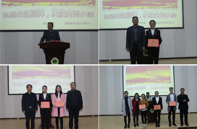 為紀念紅軍長征勝利80周年,激發(fā)師生弘揚偉大的長征精神,同時為豐富校園文化生活,展示青春正能量,藥學系團總支依據(jù)院團委的通知精神和系團學工作委員會關于增加學生課余活動的會議要求,于10月30日在正德廳組織開展了“傳承長征精神,筑我青春夢想”主題演講比賽。藥學系主任魏潤明出席了本次活動,各班班主任擔任本次比賽評委,2016級全體學生和2015級各班學生代表觀看了比賽。