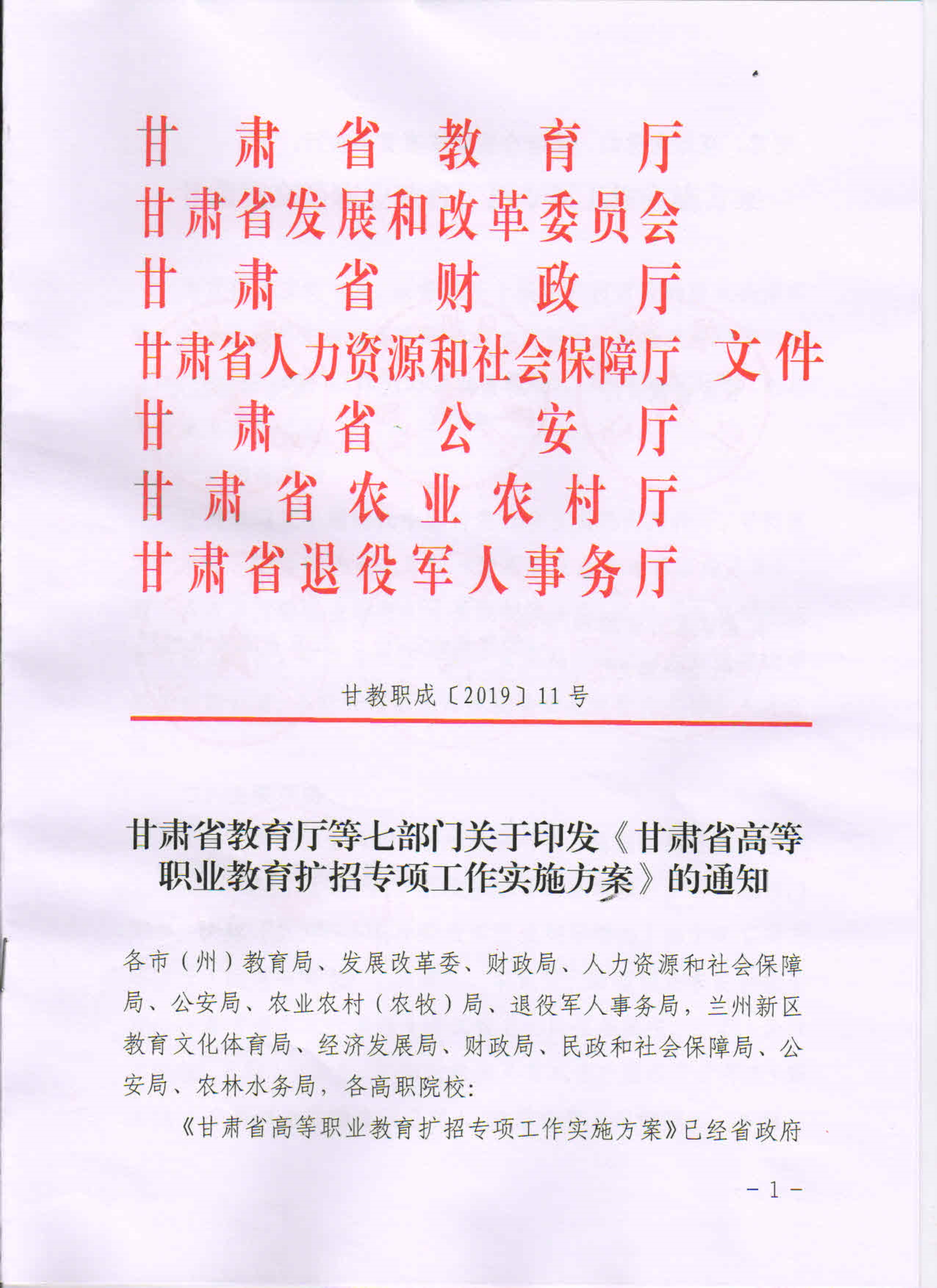 19年關(guān)于做好2019年甘肅省高等職業(yè)教育擴招專項考試招生工作的通知