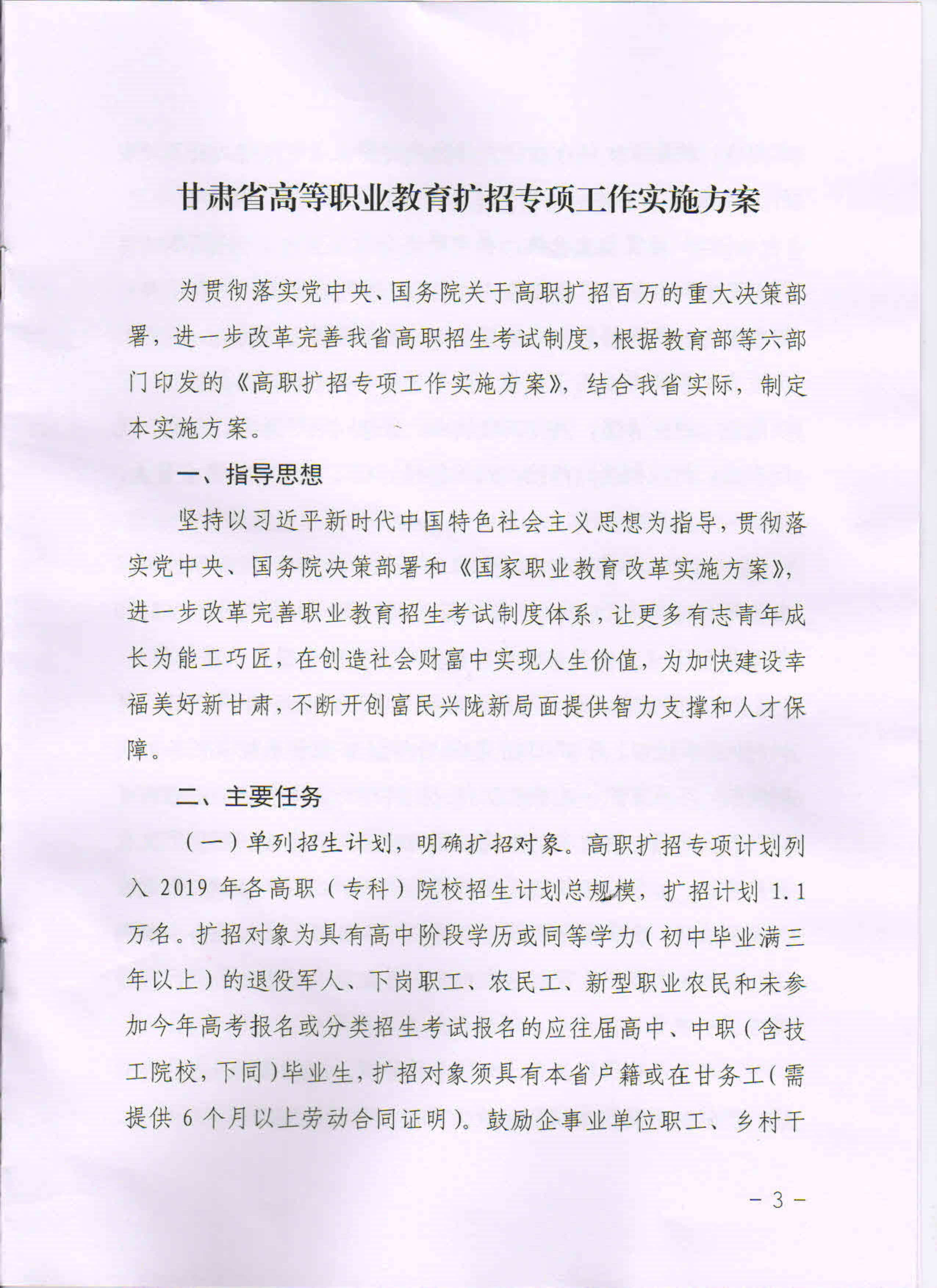 甘肅省高等職業(yè)教育擴招專項工作實施方案