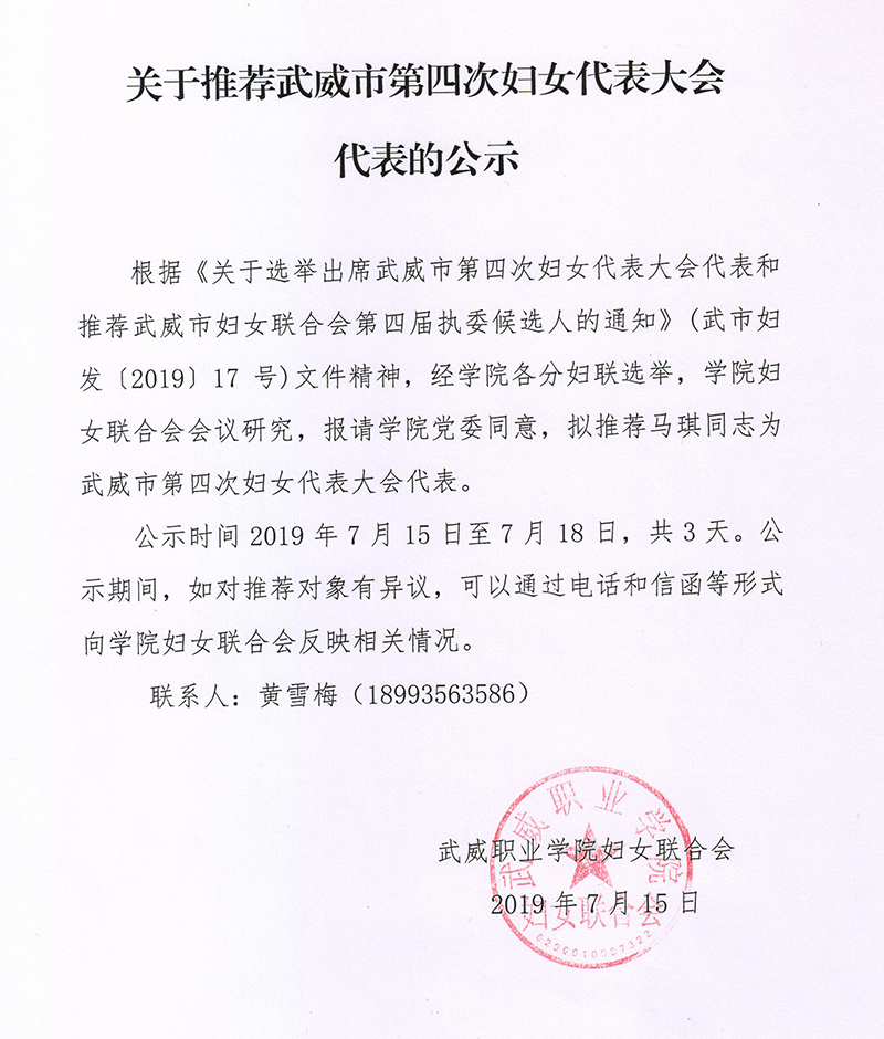 關于推薦武威市第四次婦女代表大會代表的公示
