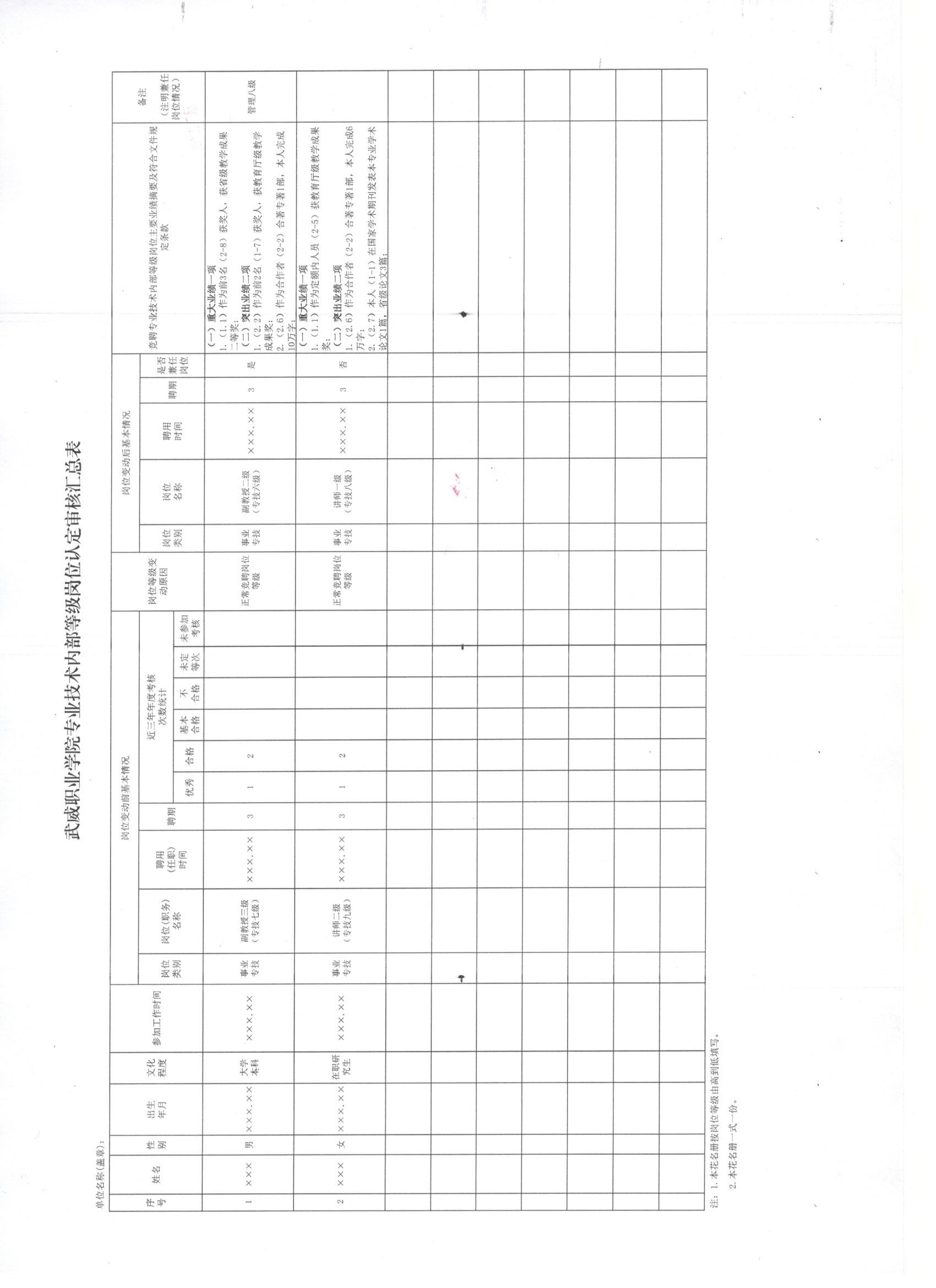 武威職業(yè)學(xué)院專業(yè)技術(shù)內(nèi)部等級崗位認(rèn)定審核匯總表2019 - 樣表