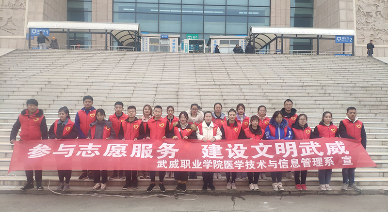 為強化大學(xué)生思想道德素質(zhì)和志愿服務(wù)精神,增強大學(xué)生奉獻服務(wù)精神,創(chuàng)建和諧、文明、美麗校園,11月23日,武威職業(yè)學(xué)院醫(yī)學(xué)技術(shù)學(xué)院團總支書記石瑞山老師帶領(lǐng)系分團委、學(xué)生會骨干及18、19級入黨積極分子在武威市火車站、汽車站開展了以“參與志愿服務(wù),建設(shè)文明武威”為主題的志愿者服務(wù)活動。