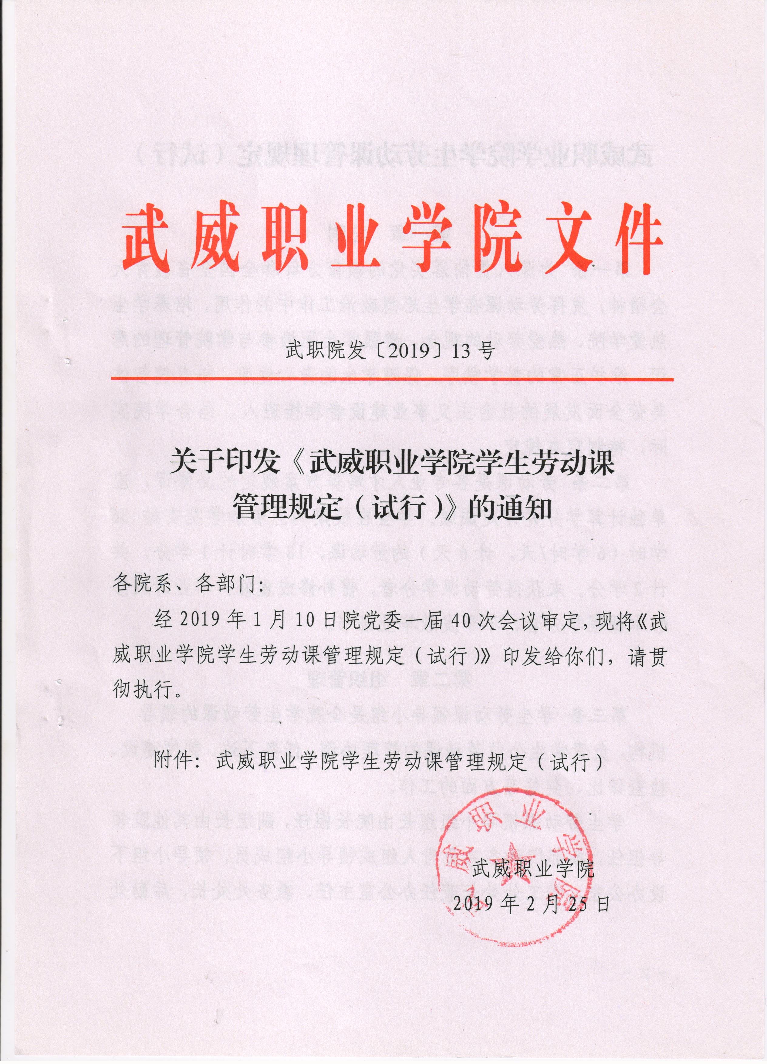 武威職業(yè)學院學生勞動課管理規(guī)定(試行)的通知