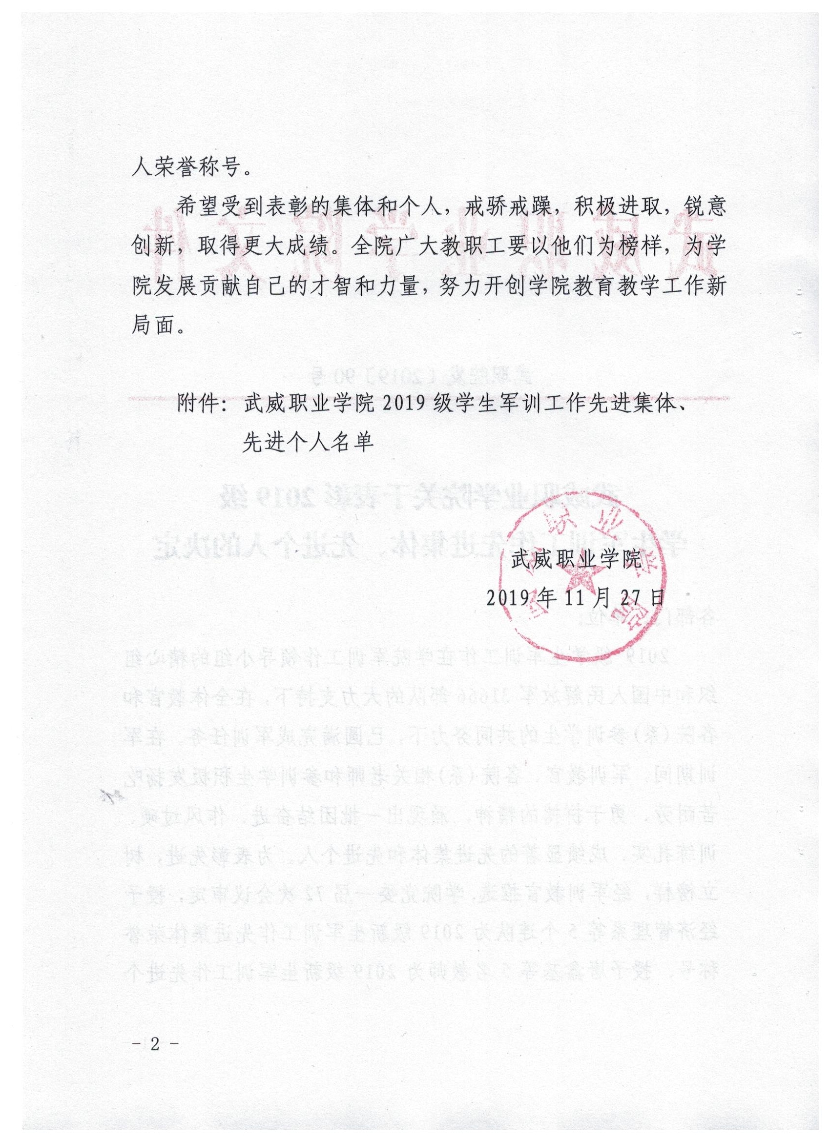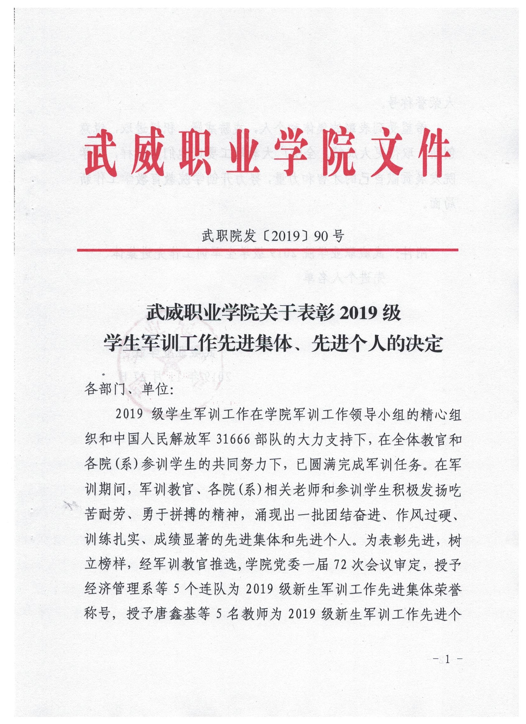 武威職業(yè)學(xué)院關(guān)于表彰2019級學(xué)生軍訓(xùn)工作先進(jìn)集體、先進(jìn)個人的決定