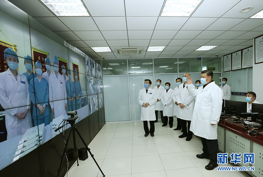 自今年1月12日起,首都醫(yī)科大學(xué)附屬北京地壇醫(yī)院開始承擔(dān)新冠肺炎患者的救治、篩查、隔離工作,收治了北京市第一例確診病例。習(xí)近平來到地壇醫(yī)院門診樓一層運行監(jiān)控中心,通過監(jiān)控畫面察看患者住院診療情況,并視頻連線正在病房值班的醫(yī)務(wù)人員,鼓勵他們繼續(xù)完善診療方案,繼續(xù)全力以赴救治患者,努力提高收治率和治愈率、降低感染率和病亡率,并叮囑他們做好自我防護(hù)。