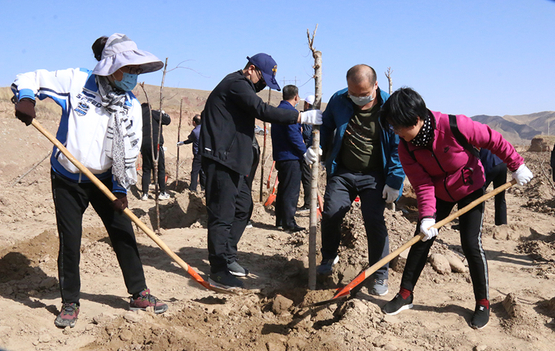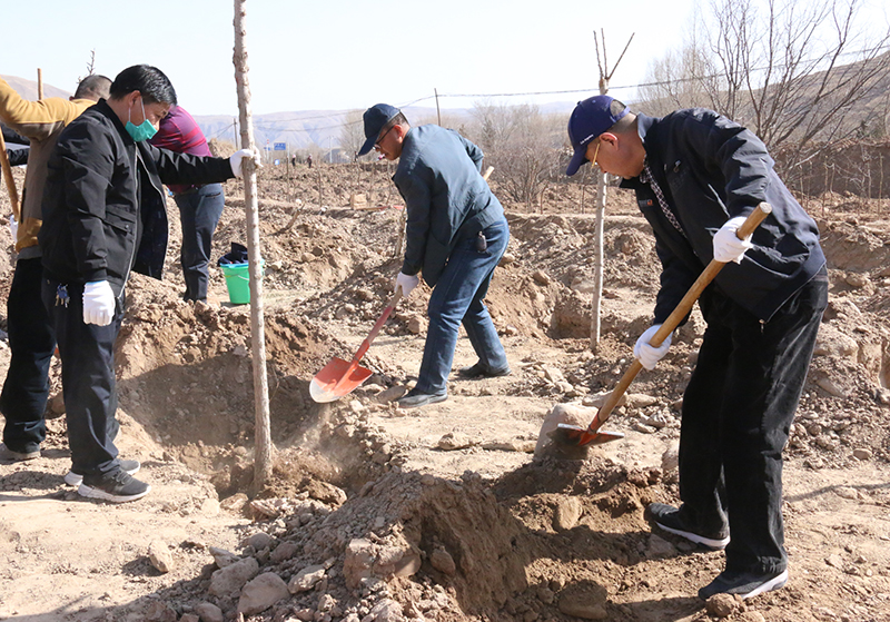 春風吹拂處,新綠綻枝頭。為深入學習貫徹習近平總書記視察甘肅的重要講話和批示精神,認真踐行綠水青山就是金山銀山的發(fā)展理念,實施綠色發(fā)展戰(zhàn)略,進一步加強祁連山生態(tài)環(huán)境保護與治理,幫助幫扶鎮(zhèn)打贏脫貧攻堅戰(zhàn),實施鄉(xiāng)村振興戰(zhàn)略,4月9日,學院領導班子成員、幫扶干部、駐村干部及部分教職工70多人深入結(jié)對幫扶鎮(zhèn)——黑松驛鎮(zhèn)開展義務植樹活動,建設“生態(tài)示范林”。春光沐浴的祁連山腳下黑松驛鎮(zhèn),春意盎然,生機勃勃,正是植樹好時節(jié)。廣大教職工一下車就拿起鐵鍬到植樹現(xiàn)場,與黑松驛鎮(zhèn)政府部分干部一起投入植樹活動,按照“橫看直線側(cè)一線、三埋兩踩一提苗”的技術(shù)要求,三人一組,分工協(xié)作,有序配合,揮鍬培土、扶苖踩土、圍堰澆水,現(xiàn)場一派熱火朝天的勞動景象。當天植樹育林約20余畝,一棵棵新栽的樹苗整齊排列,迎風挺立。通過義務植樹,廣大教職工用實際行動傳播著生態(tài)文明、綠色發(fā)展理念,切實幫助幫扶鎮(zhèn)綠起來,美起來,富起來。