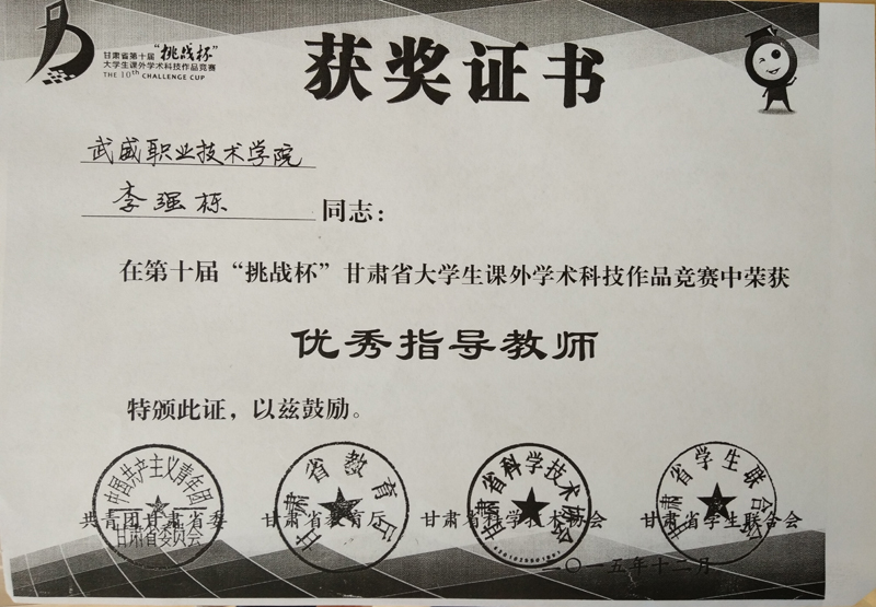 2015年6月23日,現(xiàn)代農(nóng)業(yè)技術(shù)系教師蔡海、李強(qiáng)棟赴西北師范大學(xué),參加由共青團(tuán)甘肅省委、甘肅省教育廳、甘肅省科學(xué)技術(shù)學(xué)會(huì)、甘肅省學(xué)生聯(lián)合會(huì)舉辦的甘肅省第十屆大學(xué)生“挑戰(zhàn)杯”大學(xué)生課外學(xué)術(shù)科技作品競(jìng)賽,獲得優(yōu)秀指導(dǎo)教師榮譽(yù)稱號(hào)。
