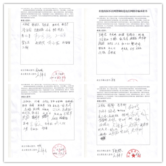 ??對學生進行校園不良網(wǎng)貸和電信網(wǎng)絡(luò)詐騙的風險告知和防范引導(dǎo)等方面的安全與警示教育,讓學生了解電信詐騙、不良網(wǎng)絡(luò)貸款等詐騙的類型、危害及防范知識技能。自愿簽訂拒絕不良網(wǎng)貸和防范電信網(wǎng)絡(luò)詐騙承諾書。
