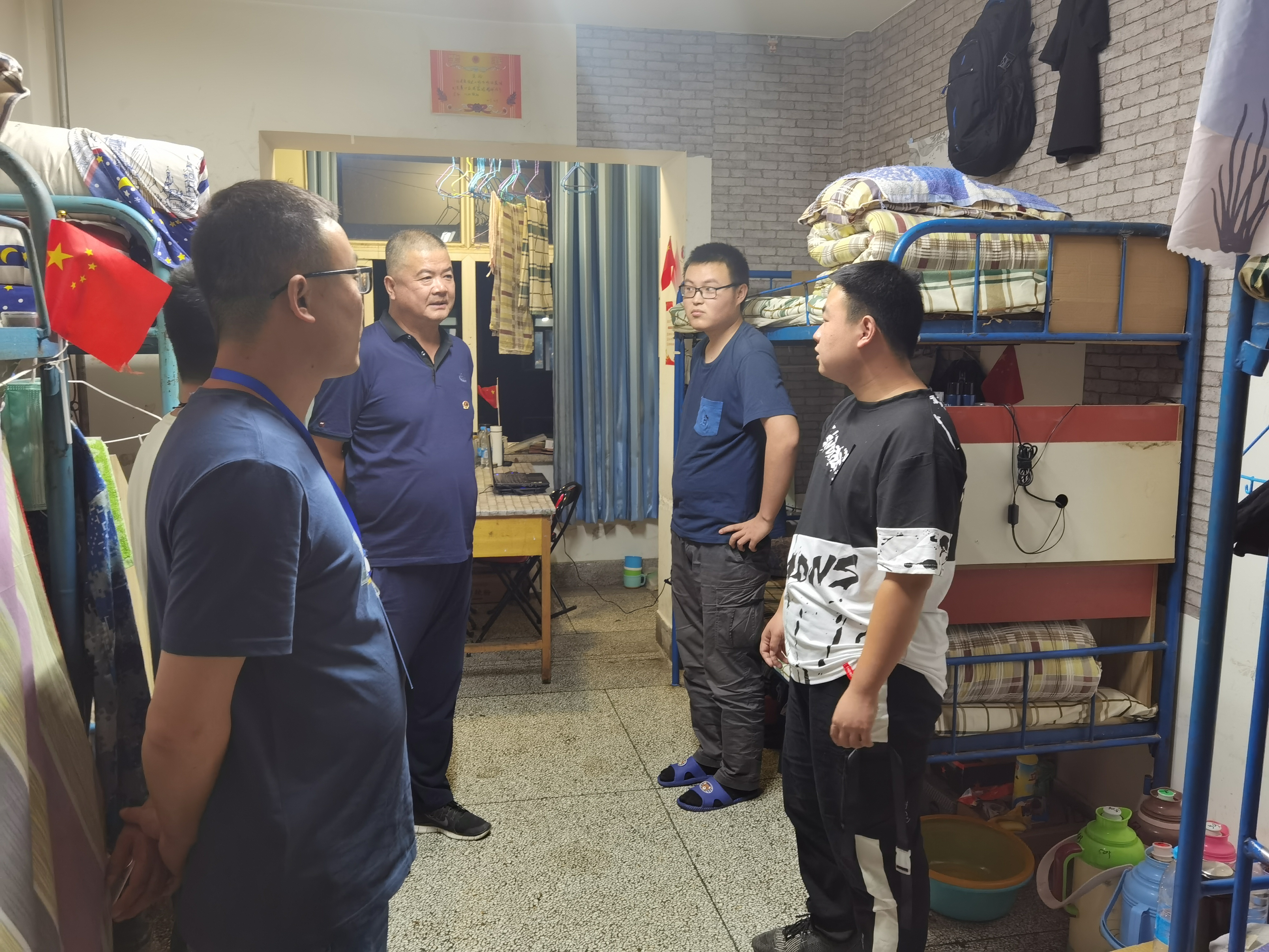 ? 6月26日晚,學(xué)院副院長(zhǎng)王守云,保衛(wèi)處處長(zhǎng)王政,學(xué)工處副處長(zhǎng)高鵬堂,教師姚斌一行深入我系學(xué)生宿舍,實(shí)地視察和慰問我系返校學(xué)生生活狀態(tài)。