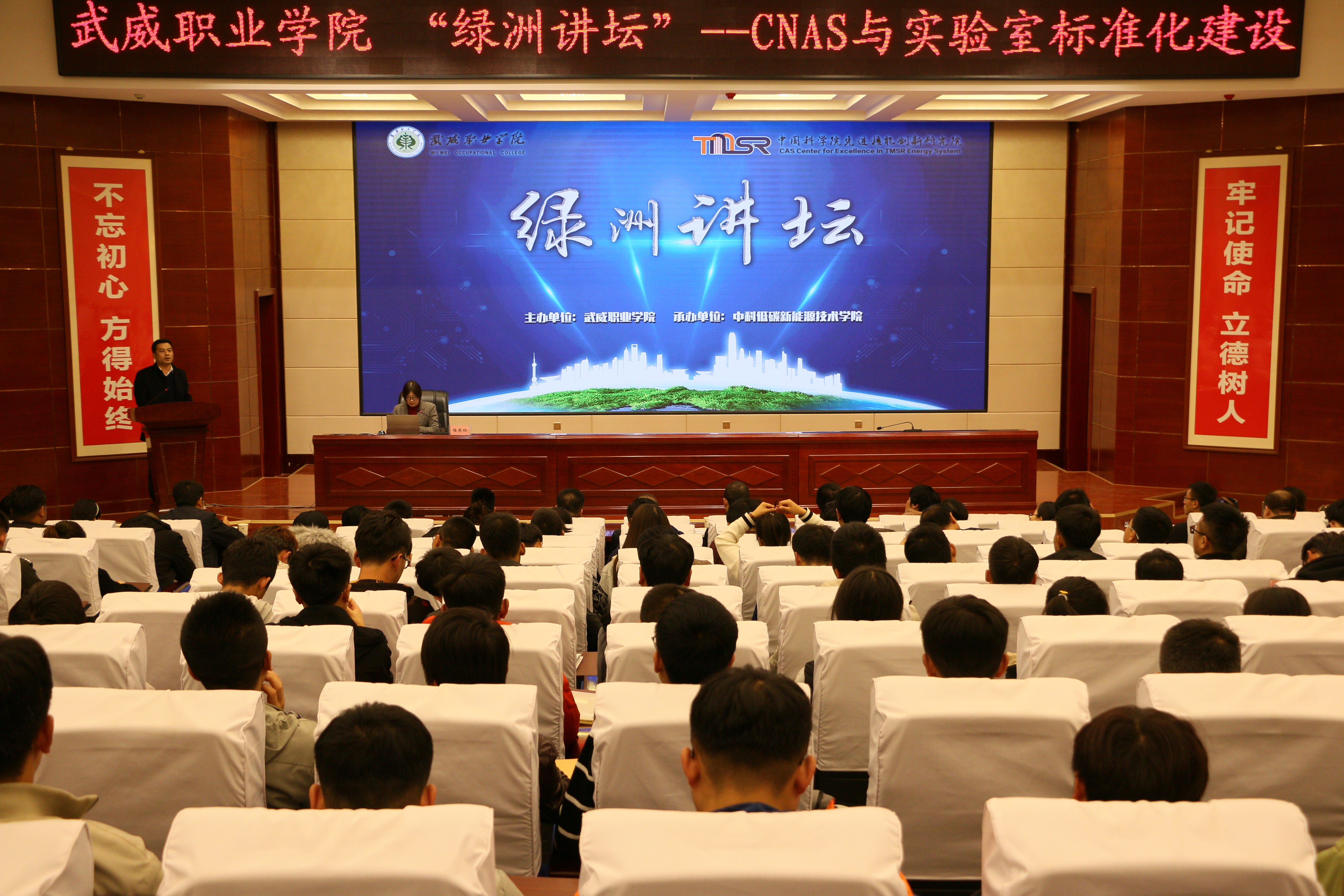 11月22日,武威職業(yè)學(xué)院“綠洲講壇”第30期在學(xué)院菁英廳舉行,本期活動(dòng)邀請(qǐng)到中科院上海應(yīng)用物理研究所研究員、全國專業(yè)標(biāo)準(zhǔn)化技術(shù)委員會(huì)委員陸燕玲博士作主題為“CNAS與實(shí)驗(yàn)室標(biāo)準(zhǔn)化建設(shè)”的報(bào)告。學(xué)院各系實(shí)驗(yàn)室管理員、實(shí)驗(yàn)課任課教師及中科低碳新能源技術(shù)學(xué)院師生代表共220人聆聽了報(bào)告。本期講壇由能源工程系副主任黃述杰主持。