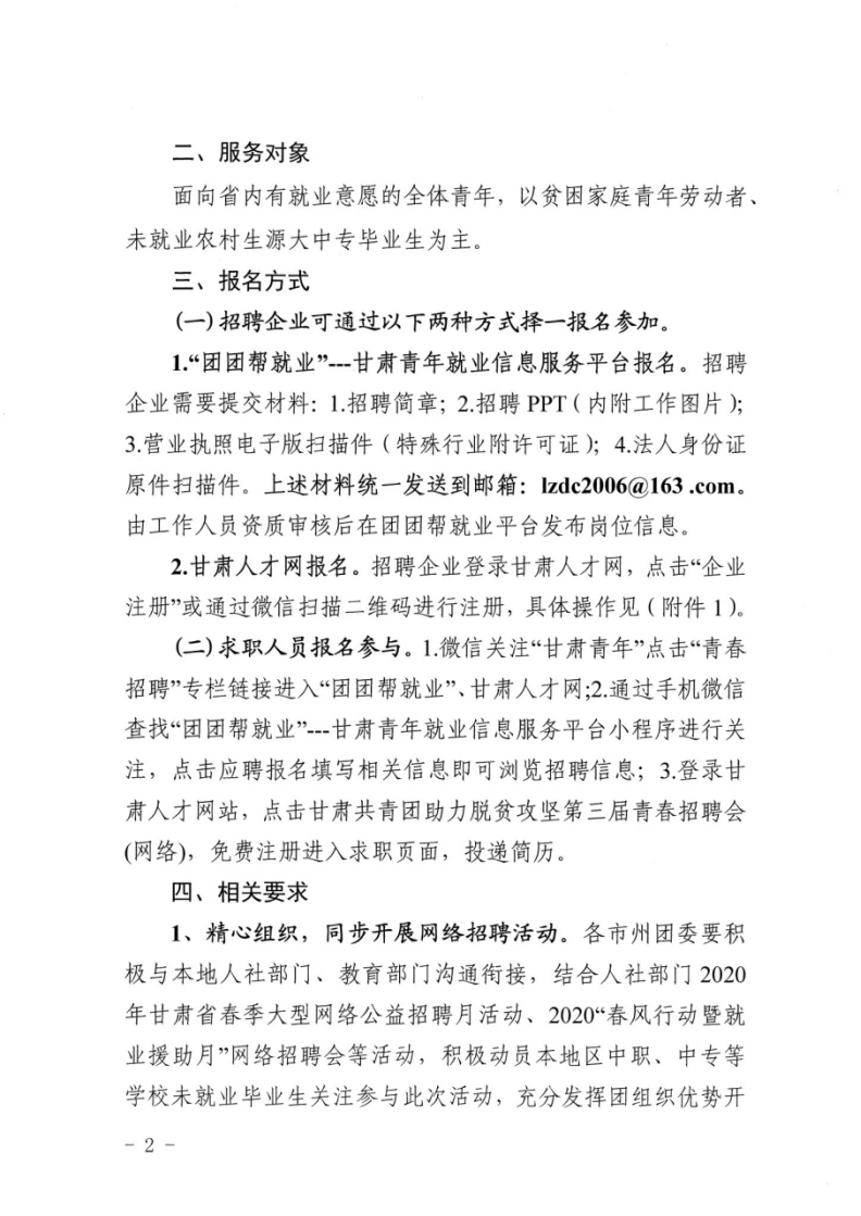 關(guān)于組織開展甘肅共青團(tuán)助力脫貧攻堅(jiān)第三屆青春招聘會(huì)(網(wǎng)絡(luò))活動(dòng)的通知