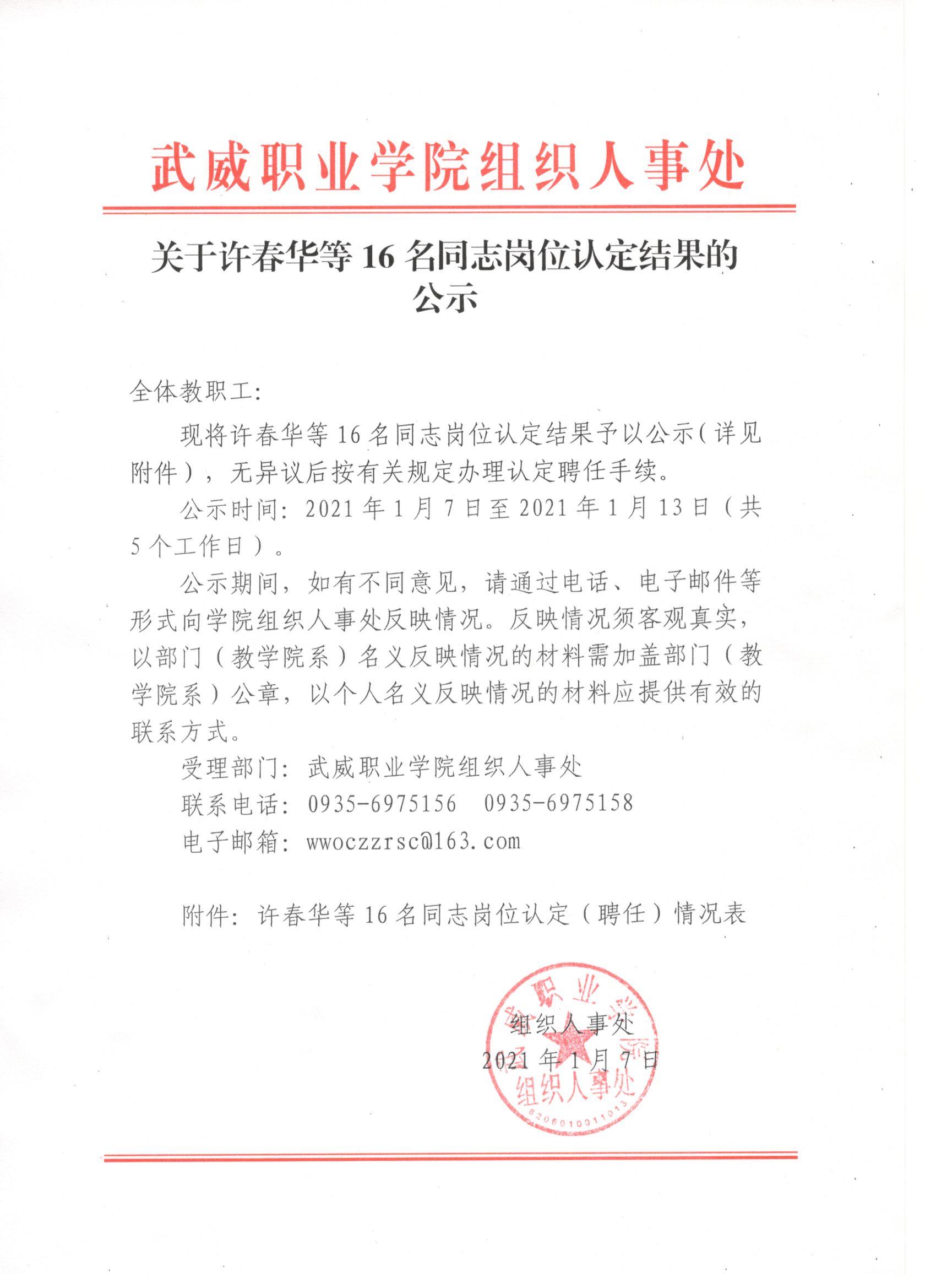 關于許春華等16名同志崗位認定結果的公示
