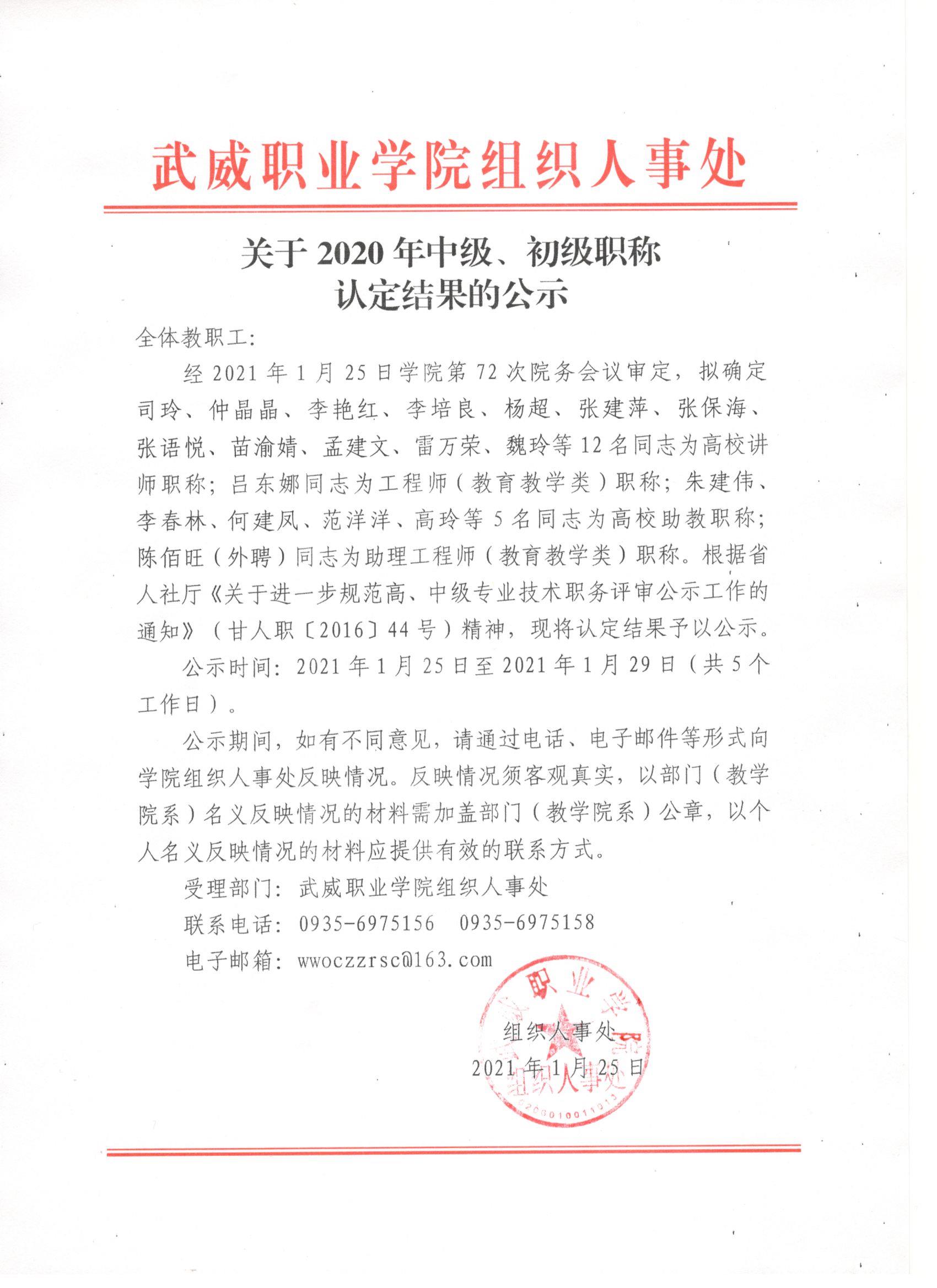 關于2020年中級、初級職稱認定結果的公示