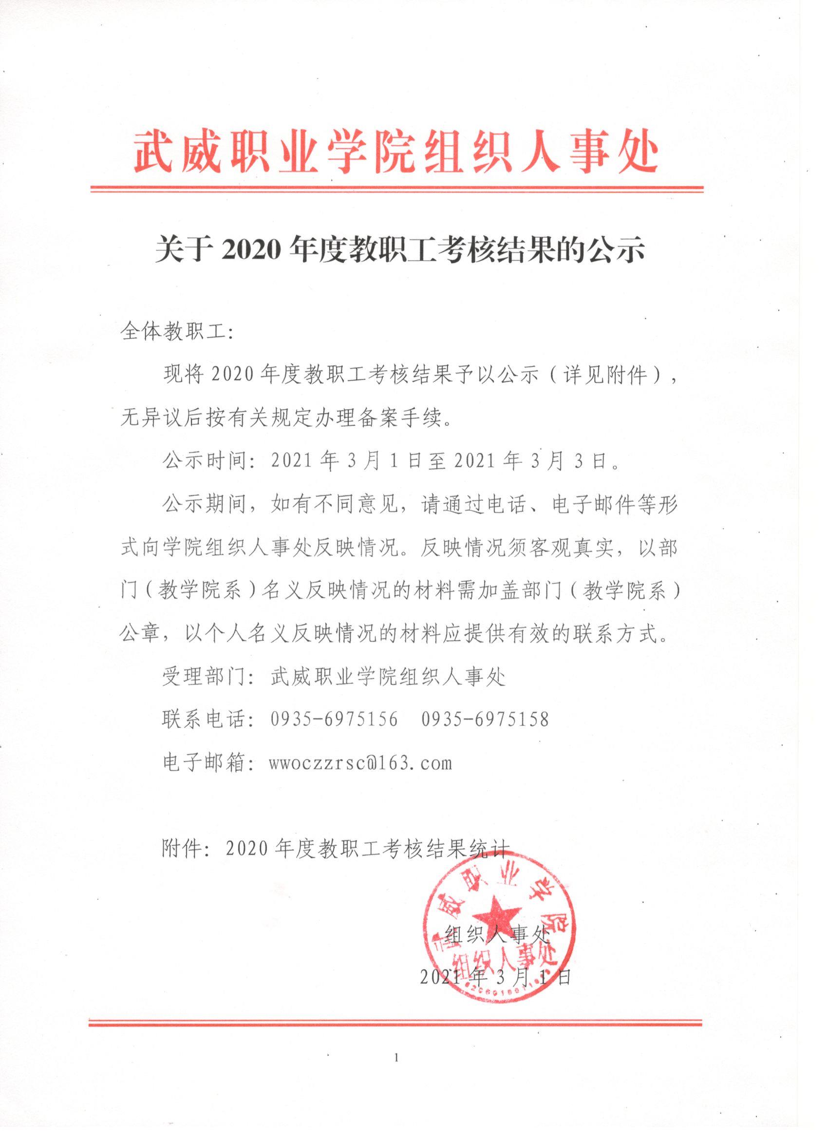 關于2020年度教職工考核結果的公示