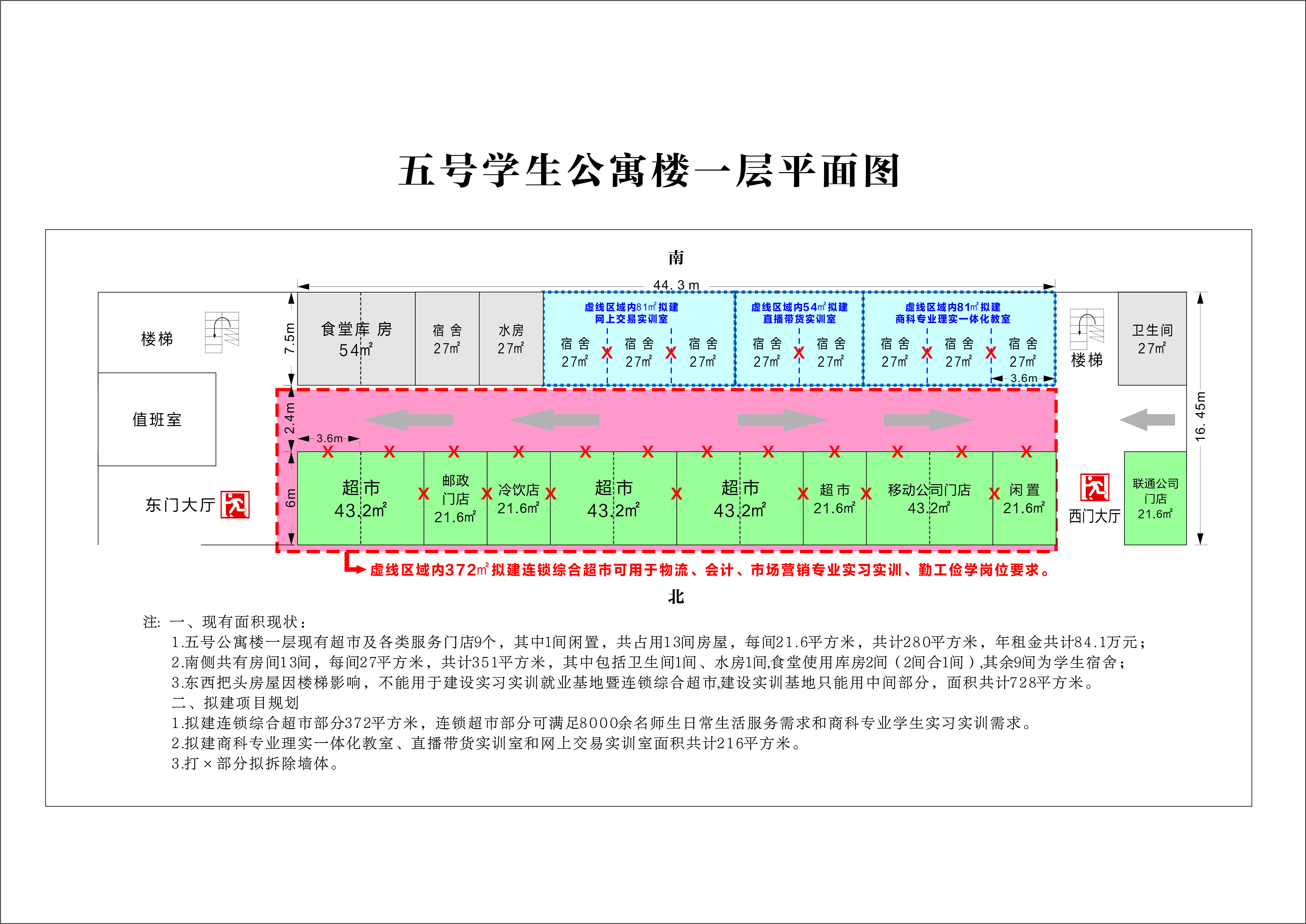 4.學院提供五號學生公寓樓一層面積共計728平方米場地用于建設(shè)學院商科專業(yè)所需產(chǎn)教融合實習實訓就業(yè)基地暨連鎖綜合超市,其中,216平方米用于建設(shè)商科專業(yè)理實一體化教室、直播帶貨實訓室和網(wǎng)上交易實訓室;372平方米(原商鋪面積為259平方米,增加113平方米為樓道走廊)用于建設(shè)連鎖綜合超市及實訓場所,滿足師生日常生活需求和商科專業(yè)學生頂崗實習、實訓、勤工儉學等(改建方案詳見附后平面圖)。建設(shè)所需手續(xù)由學院和企業(yè)雙方配合完成辦理。