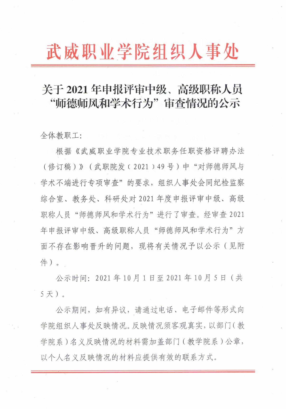 關(guān)于2021年申報(bào)評(píng)審中級(jí)、高級(jí)職稱人員“師德師風(fēng)和學(xué)術(shù)行為”審查情況的公示
