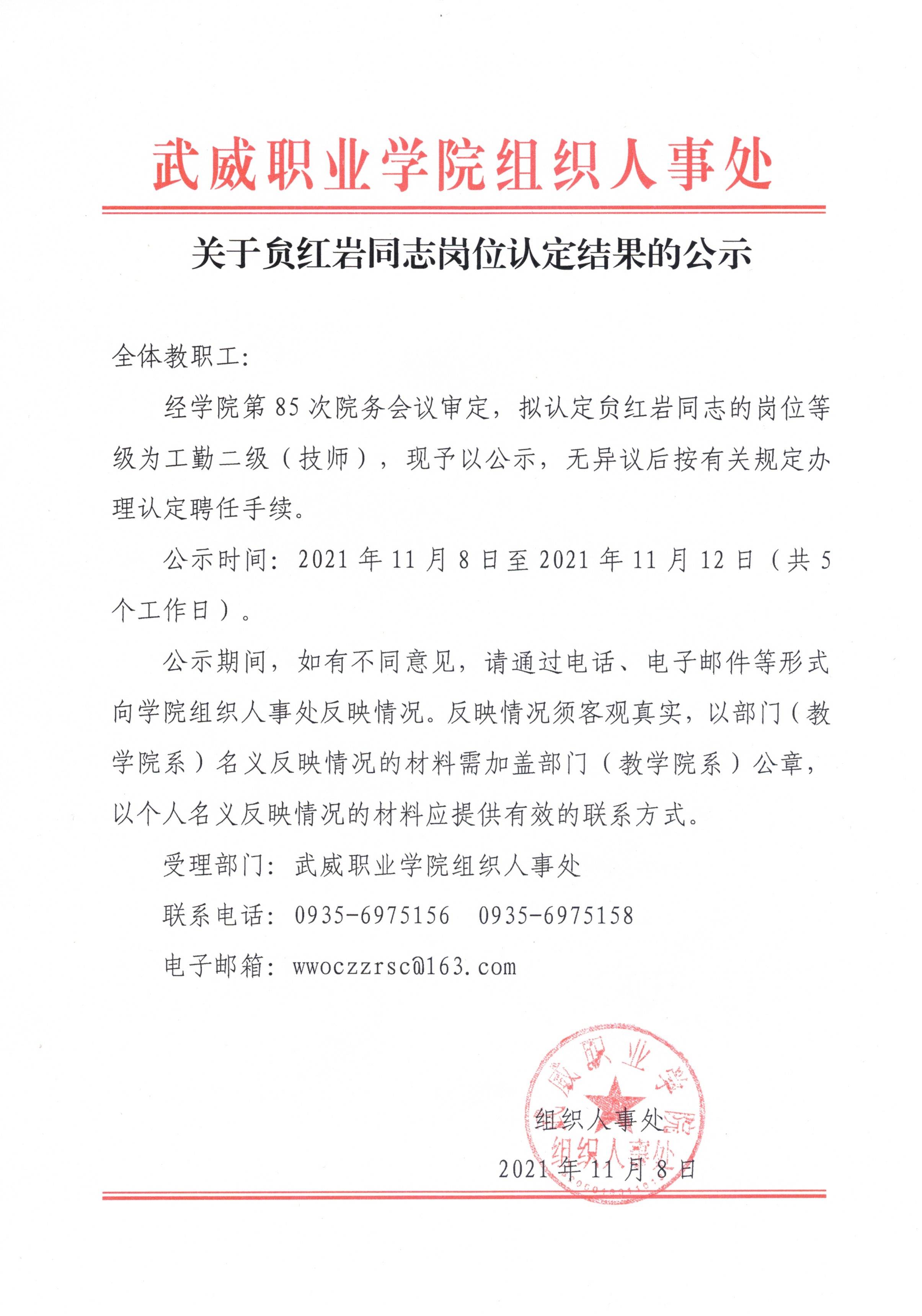 關(guān)于贠紅巖同志崗位認(rèn)定結(jié)果的公示