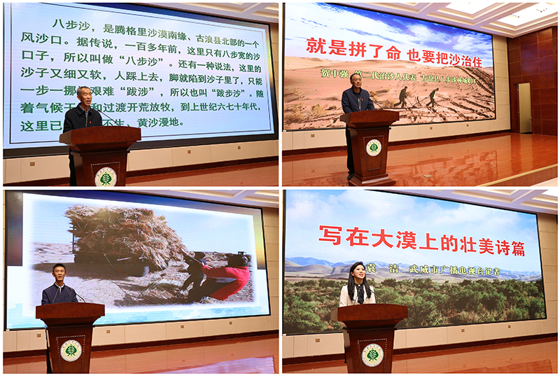 報告會上,二代治沙人代表、八步沙林場場長郭萬剛,二代治沙人代表、八步沙林場職工賀中強,三代治沙人、八步沙林場管護(hù)員郭璽、武威市廣播電視臺記者袁潔,分別從綠色承諾、使命責(zé)任、接續(xù)奮斗、記者見證等不同角度、不同側(cè)面,生動再現(xiàn)了“六老漢”三代人治沙造林持續(xù)改善生態(tài)環(huán)境、讓沙漠披綠生金的感人事跡。在場師生無不為“六老漢”三代人的感人事跡深深震撼,紛紛表示要學(xué)習(xí)和繼承“六老漢”三代人困難面前不低頭、敢把沙漠變綠洲的奮斗精神,為建設(shè)美麗中國、實現(xiàn)中華民族永續(xù)發(fā)展貢獻(xiàn)自己的青春力量。