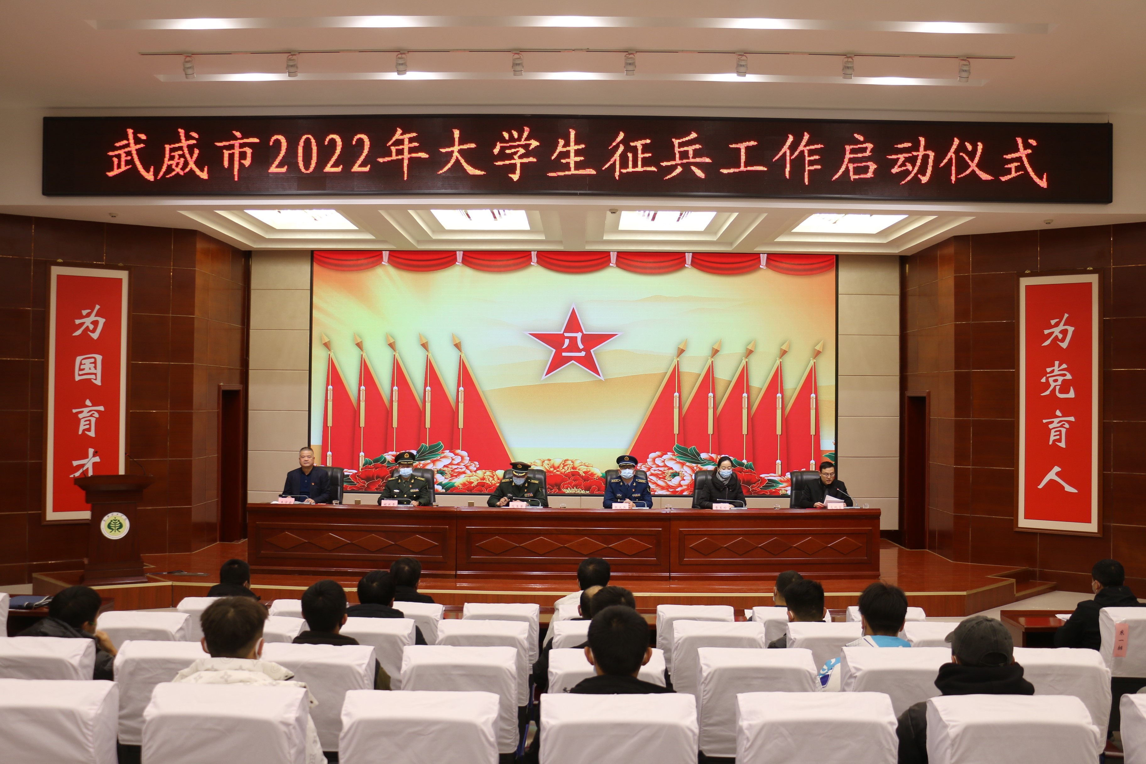 12月29日下午,武威市2022年大學(xué)生征兵工作啟動儀式在我院舉辦。武威軍分區(qū)司令員范玉芳、武威軍分區(qū)動員處處長張尖兵、武威市教育局副局長賈玉玲、涼州區(qū)人武部部長闞延貴,學(xué)院黨委委員、副院長王守云出席會議。學(xué)院各院系輔導(dǎo)員、2021年退役復(fù)學(xué)大學(xué)生代表和應(yīng)征報名學(xué)生代表參加了會議。會議由學(xué)生工作處負責(zé)人高鵬堂主持。會議采取線下進行和線上同步直播的方式召開。