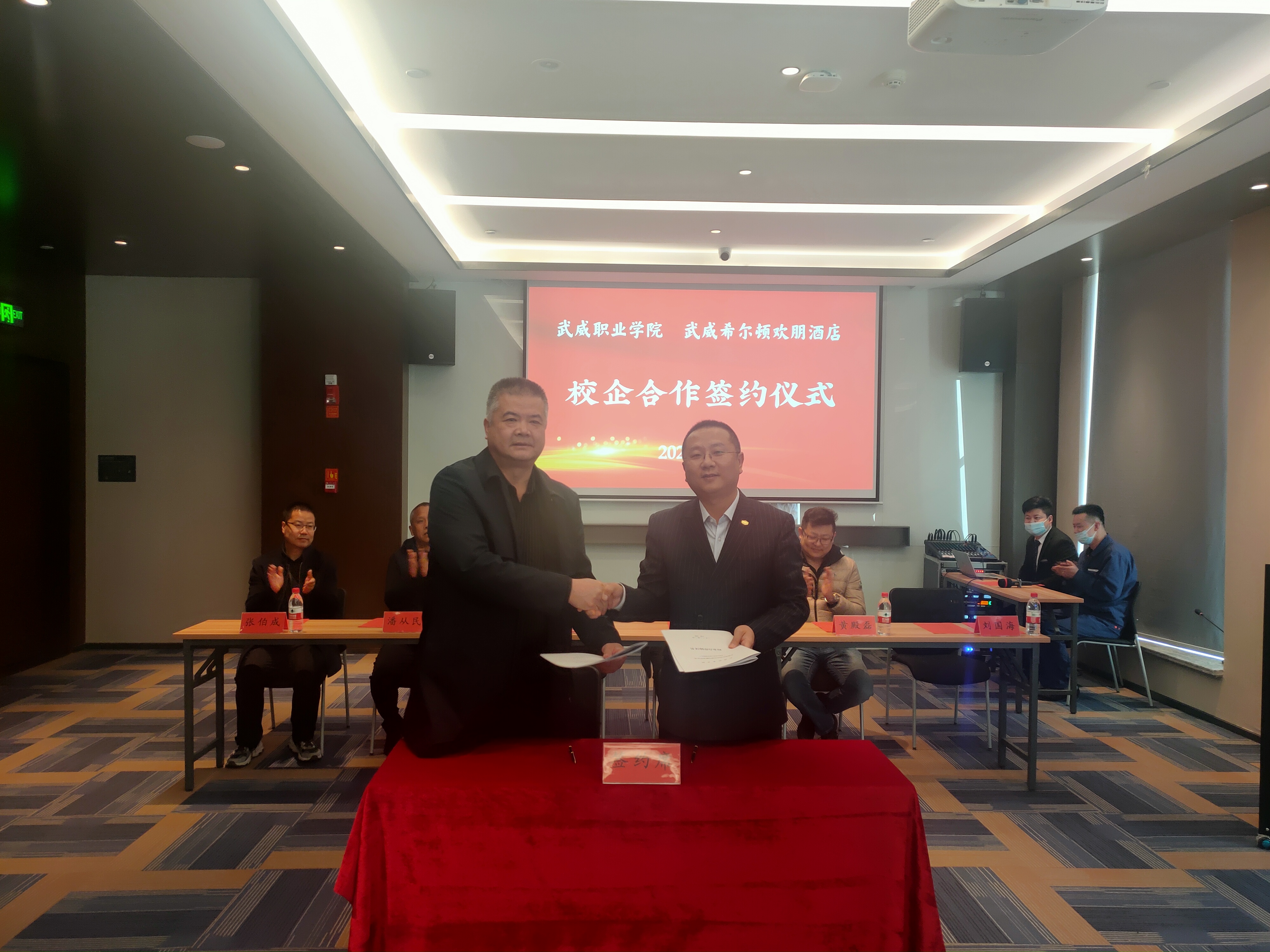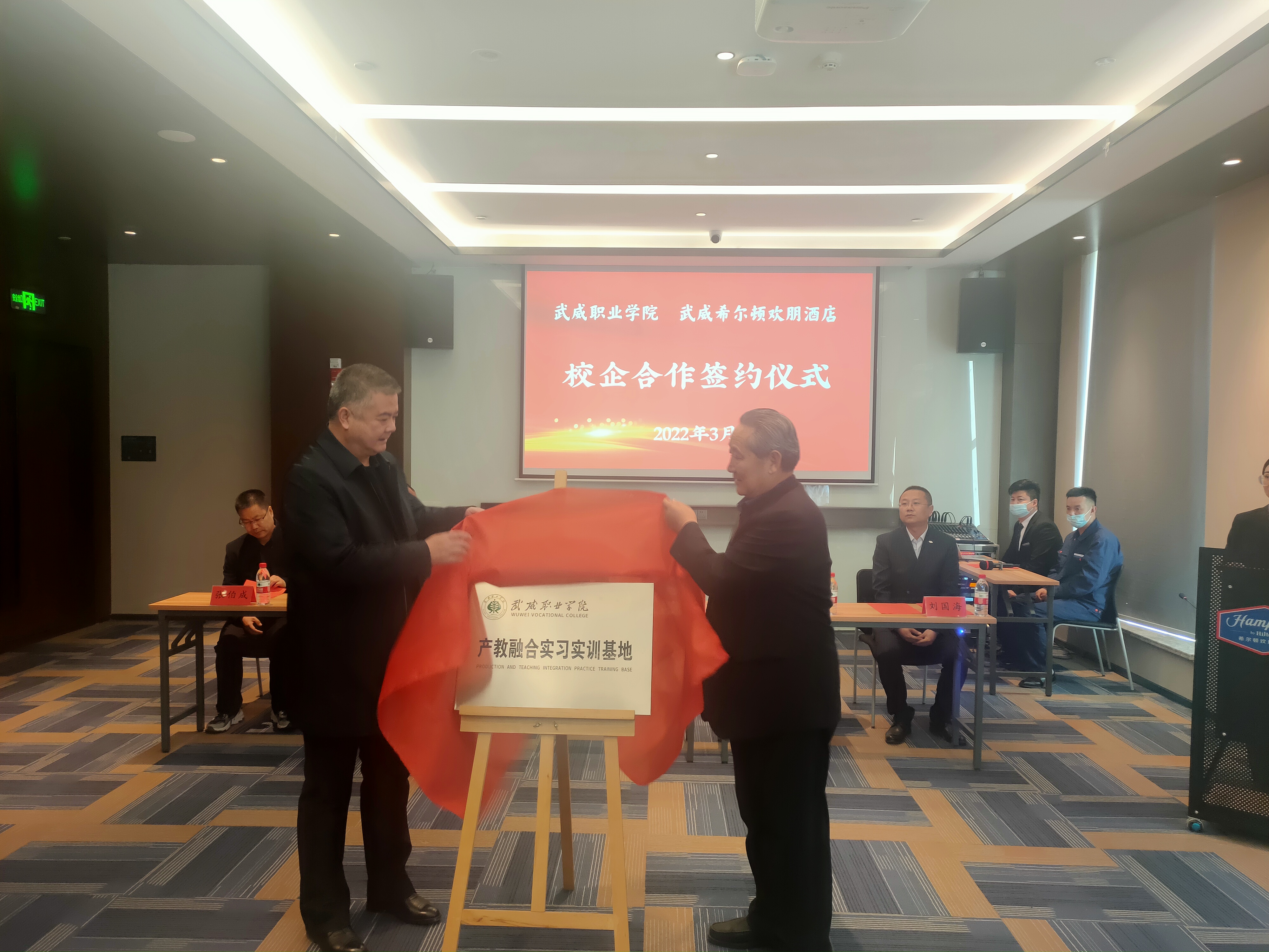 為深入貫徹落實(shí)教育部2022屆普通高校畢業(yè)生就業(yè)創(chuàng)業(yè)網(wǎng)絡(luò)視頻會(huì)議精神,統(tǒng)一思想,提高認(rèn)識(shí),服務(wù)學(xué)院“雙高計(jì)劃”建設(shè),3月2日,學(xué)院與武威希爾頓歡朋酒店舉行校企合作揭牌暨簽約儀式,副校長(zhǎng)王守云代表學(xué)院出席簽約儀式。