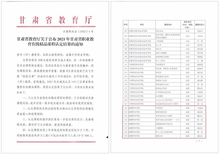 藥學(xué)院王建強負(fù)責(zé)的《中藥化學(xué)》、經(jīng)濟管理學(xué)院張海燕負(fù)責(zé)的《隴原民族民俗》、中科低碳新能源技術(shù)學(xué)院魏顯文負(fù)責(zé)的《光伏電站運行與維護》、張國祥負(fù)責(zé)的《智能微電網(wǎng)應(yīng)用技術(shù)》、藝術(shù)與教育學(xué)院薛媛負(fù)責(zé)的《美術(shù)與幼兒美術(shù)創(chuàng)作——手工》、現(xiàn)代農(nóng)業(yè)學(xué)院柴貴賢負(fù)責(zé)的《土壤肥料》、工程技術(shù)學(xué)院頡棟負(fù)責(zé)的《焊接工藝與技能訓(xùn)練》、趙特慶負(fù)責(zé)的《建筑CAD》8門課程獲評甘肅職業(yè)教育在線精品課程。