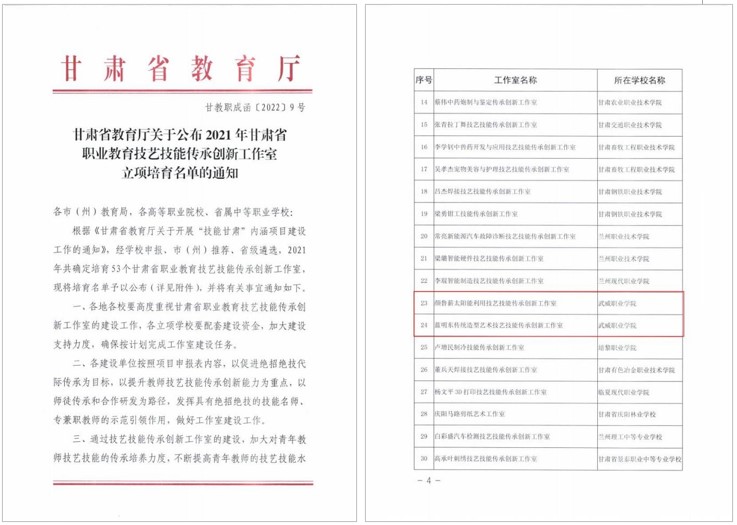 創(chuàng)新創(chuàng)業(yè)中心顏魯薪負(fù)責(zé)的“顏魯薪太陽能利用技藝技能傳承創(chuàng)新工作室”和藝術(shù)與教育學(xué)院藍明東負(fù)責(zé)的“藍明東傳統(tǒng)造型藝術(shù)技藝技能傳承創(chuàng)新工作室”獲評甘肅省職業(yè)教育技藝技能傳承創(chuàng)新工作室。