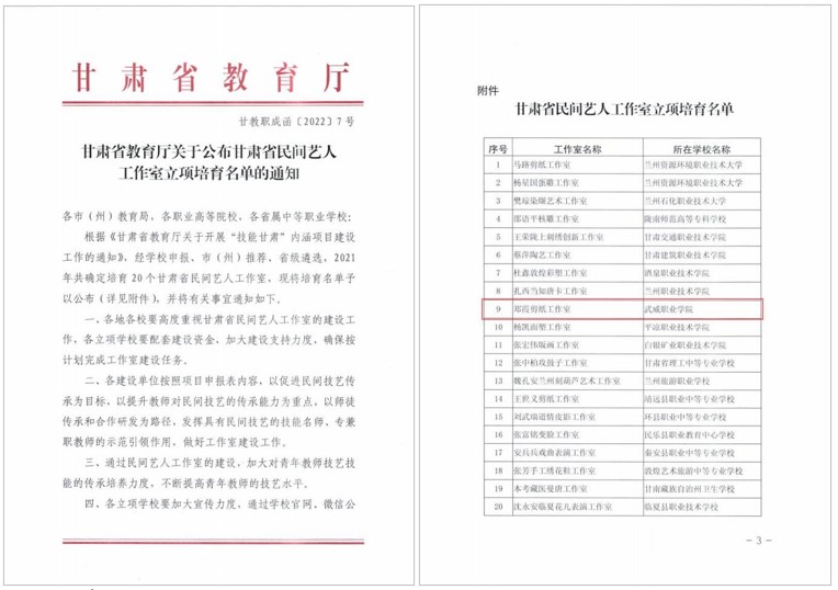 民間藝人、學(xué)校非遺技能指導(dǎo)教師鄭霞合作申報的“鄭霞剪紙工作室”,獲評甘肅省民間藝人工作室。