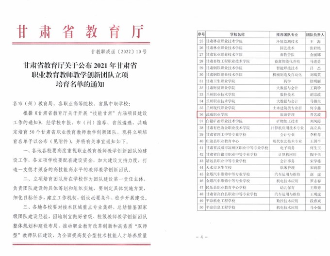 經(jīng)濟管理學(xué)院晉藝波負(fù)責(zé)的“旅游管理”專業(yè)教學(xué)團隊獲評甘肅省職業(yè)教育教師教學(xué)創(chuàng)新團隊。