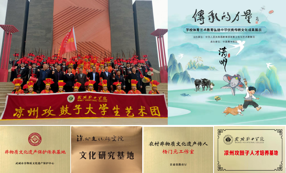 近年來,學(xué)校全力推進“雙高計劃”項目建設(shè),組織成立了武威職業(yè)學(xué)院涼州攻鼓子大學(xué)生藝術(shù)團,聘請國家級非遺代表性傳承人楊門元親傳技藝,并開展了系列展演活動,著力打造特色校園文化品牌,助推文化繁榮、社會文明的新武威和華夏文明傳承創(chuàng)新區(qū)建設(shè),服務(wù)鄉(xiāng)村振興戰(zhàn)略。
