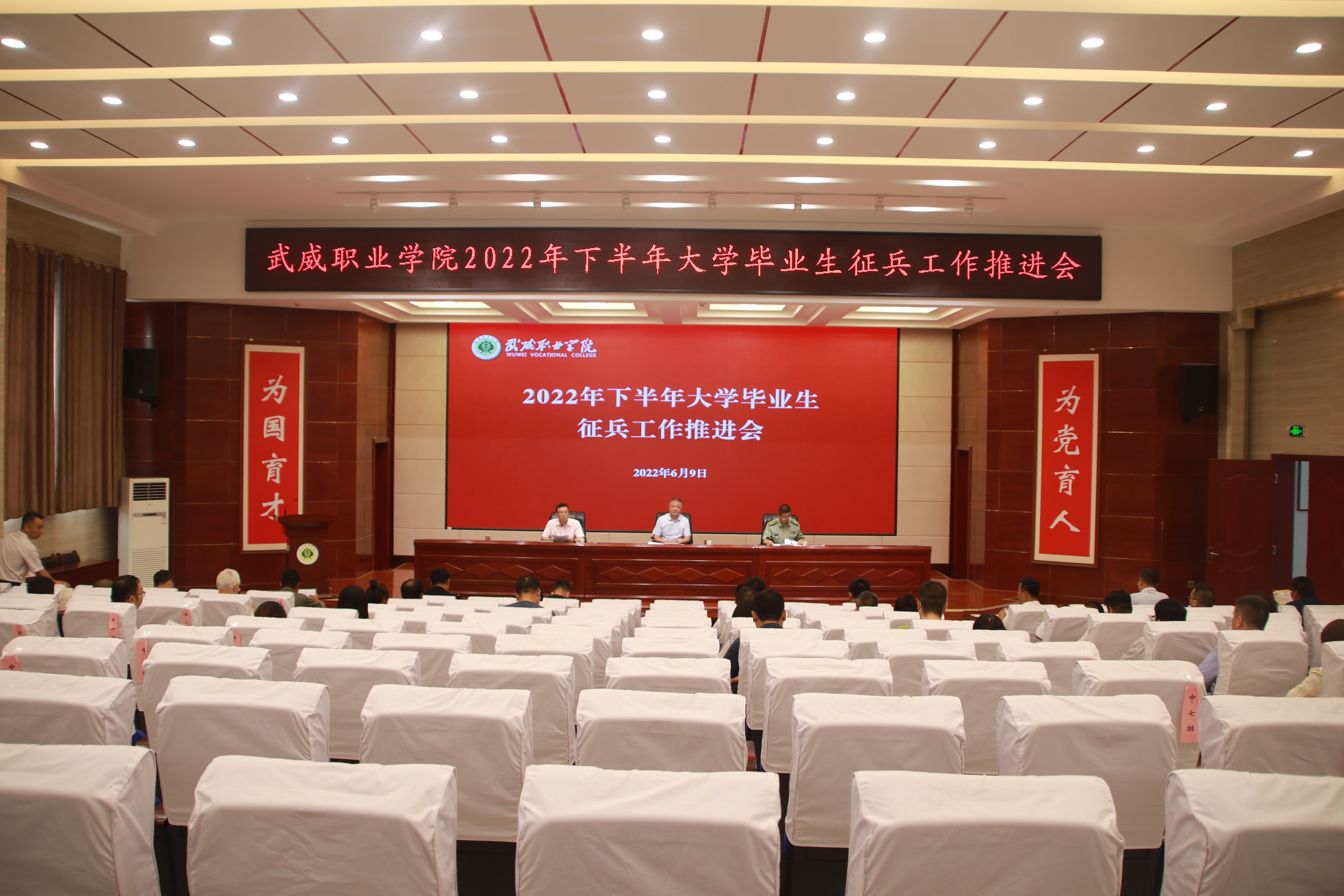 6月9日下午,學(xué)校2022年下半年大學(xué)畢業(yè)生征兵工作推進(jìn)會(huì)在菁英廳召開,學(xué)校黨委委員、副校長(zhǎng)王守云,涼州區(qū)人武部中校副部長(zhǎng)何志強(qiáng)出席會(huì)議。