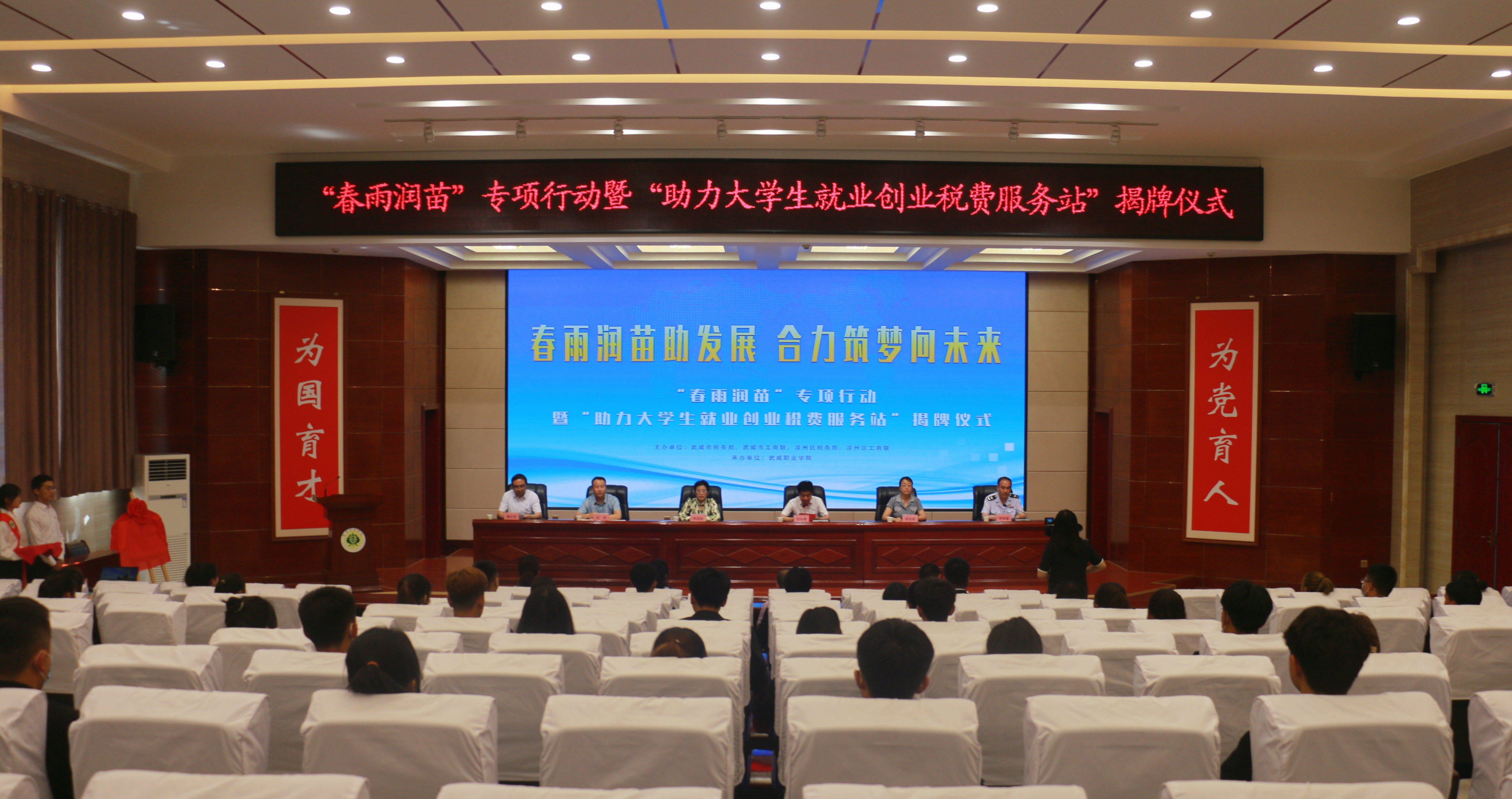 6月10日下午,武威市稅務(wù)局聯(lián)合工商聯(lián)在學(xué)校菁英廳舉辦“春雨潤(rùn)苗”專項(xiàng)行動(dòng)暨“助力大學(xué)生就業(yè)創(chuàng)業(yè)稅費(fèi)服務(wù)站”揭牌儀式。武威市稅務(wù)局黨委委員、副局長(zhǎng)劉永德,武威市工商聯(lián)副主席張連科,涼州區(qū)工商聯(lián)副主席唐紅生,學(xué)校黨委委員、副校長(zhǎng)田迎春出席揭牌儀式,涼州區(qū)稅務(wù)局黨委委員、副局長(zhǎng)李斌盛主持活動(dòng)。武威市稅務(wù)局黨委委員、副局長(zhǎng)劉永德在講話中指出“助力大學(xué)生就業(yè)創(chuàng)業(yè)稅費(fèi)服務(wù)站”的成立,既是武威稅務(wù)部門優(yōu)化稅費(fèi)服務(wù)的有力舉措,也是學(xué)院、工商聯(lián)和稅務(wù)的一次深入合作,更是三方匯聚合力,助力穩(wěn)就業(yè)、保民生、促發(fā)展的積極作為。”