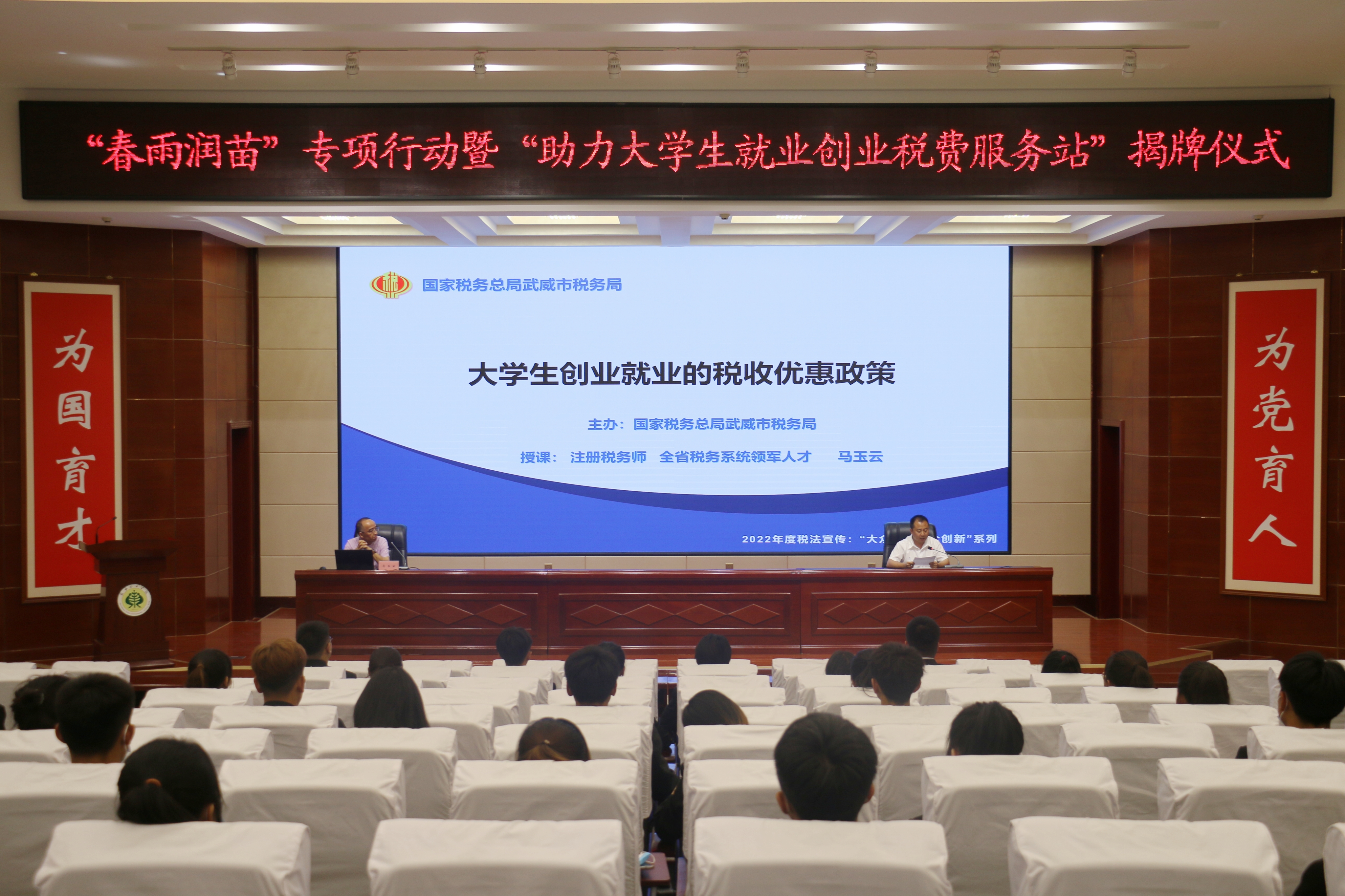 6月10日下午,武威市稅務(wù)局聯(lián)合工商聯(lián)在學(xué)校菁英廳舉辦“春雨潤(rùn)苗”專項(xiàng)行動(dòng)暨“助力大學(xué)生就業(yè)創(chuàng)業(yè)稅費(fèi)服務(wù)站”揭牌儀式。武威市稅務(wù)局黨委委員、副局長(zhǎng)劉永德,武威市工商聯(lián)副主席張連科,涼州區(qū)工商聯(lián)副主席唐紅生,學(xué)校黨委委員、副校長(zhǎng)田迎春出席揭牌儀式,涼州區(qū)稅務(wù)局黨委委員、副局長(zhǎng)李斌盛主持活動(dòng)。武威市稅務(wù)局黨委委員、副局長(zhǎng)劉永德在講話中指出“助力大學(xué)生就業(yè)創(chuàng)業(yè)稅費(fèi)服務(wù)站”的成立,既是武威稅務(wù)部門優(yōu)化稅費(fèi)服務(wù)的有力舉措,也是學(xué)院、工商聯(lián)和稅務(wù)的一次深入合作,更是三方匯聚合力,助力穩(wěn)就業(yè)、保民生、促發(fā)展的積極作為?!?/p>