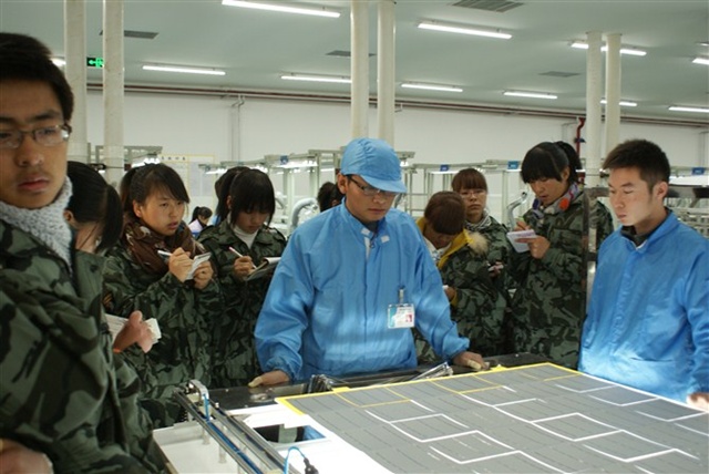 在校外實(shí)訓(xùn)過程中,由工藝部楊經(jīng)理和工藝部文工程師給大家介紹公司情況、公司管理規(guī)范,并帶領(lǐng)大家進(jìn)行參觀,給學(xué)生詳細(xì)講解整個(gè)光伏產(chǎn)業(yè)鏈,包括硅片的生產(chǎn)、電池片的生產(chǎn)和太陽能電池組件的生產(chǎn),重點(diǎn)是光伏組件的生產(chǎn)。實(shí)訓(xùn)期間由工廠師傅帶領(lǐng)學(xué)生在車間分組進(jìn)行實(shí)訓(xùn)。依據(jù)光伏組件生產(chǎn)工作流程實(shí)訓(xùn)內(nèi)容分為前道工序和后道工序,前道工序包括:電池片篩選、單焊、串焊、疊層、初檢、EL1測(cè)試和層壓;后道工序包括:削邊、裝邊框、裝接線盒、清洗、EL2測(cè)試、功率測(cè)試、終檢和包裝入庫。同學(xué)們通過親身體驗(yàn)和輪崗學(xué)習(xí),熟悉了光伏組件的每一道生產(chǎn)工序,對(duì)光伏組件的整個(gè)生產(chǎn)過程有了一個(gè)更加清晰的認(rèn)識(shí)和了解。