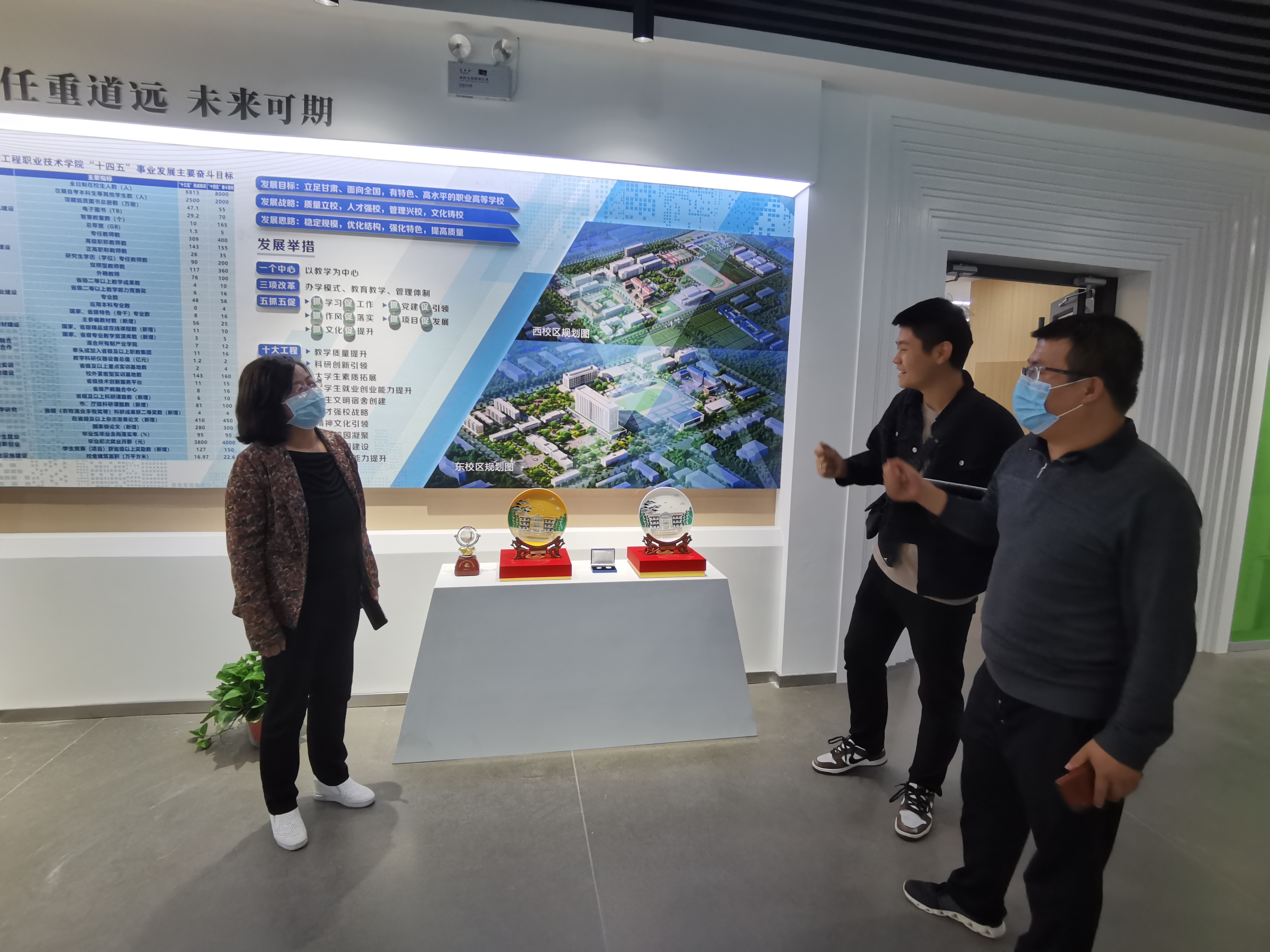 為全面推進(jìn)“雙高計劃”學(xué)校建設(shè),提升圖書館服務(wù)水平,營造“書香校園”,將圖書館打造成人性化、智能化、專業(yè)化的綠色學(xué)習(xí)空間。近日,圖書館館長楊如松、副館長蔡濟(jì)眾、館員楊建盛三人到甘肅省畜牧工程職業(yè)技術(shù)學(xué)院圖書館考察學(xué)習(xí),在甘肅省畜牧工程職業(yè)技術(shù)學(xué)院圖書館館長解玉寶陪同下,參觀了該校圖書館讀書吧、校史館、黨史館、“挑戰(zhàn)杯”獲獎作品展覽館等處,解玉寶講解了該館設(shè)計理念及建設(shè)過程中的側(cè)重點和展示重點。楊如松就現(xiàn)在圖書館裝發(fā)展趨勢、圖書館管理辦法、學(xué)生借閱量等實際問題同解玉寶進(jìn)行了相互交流。