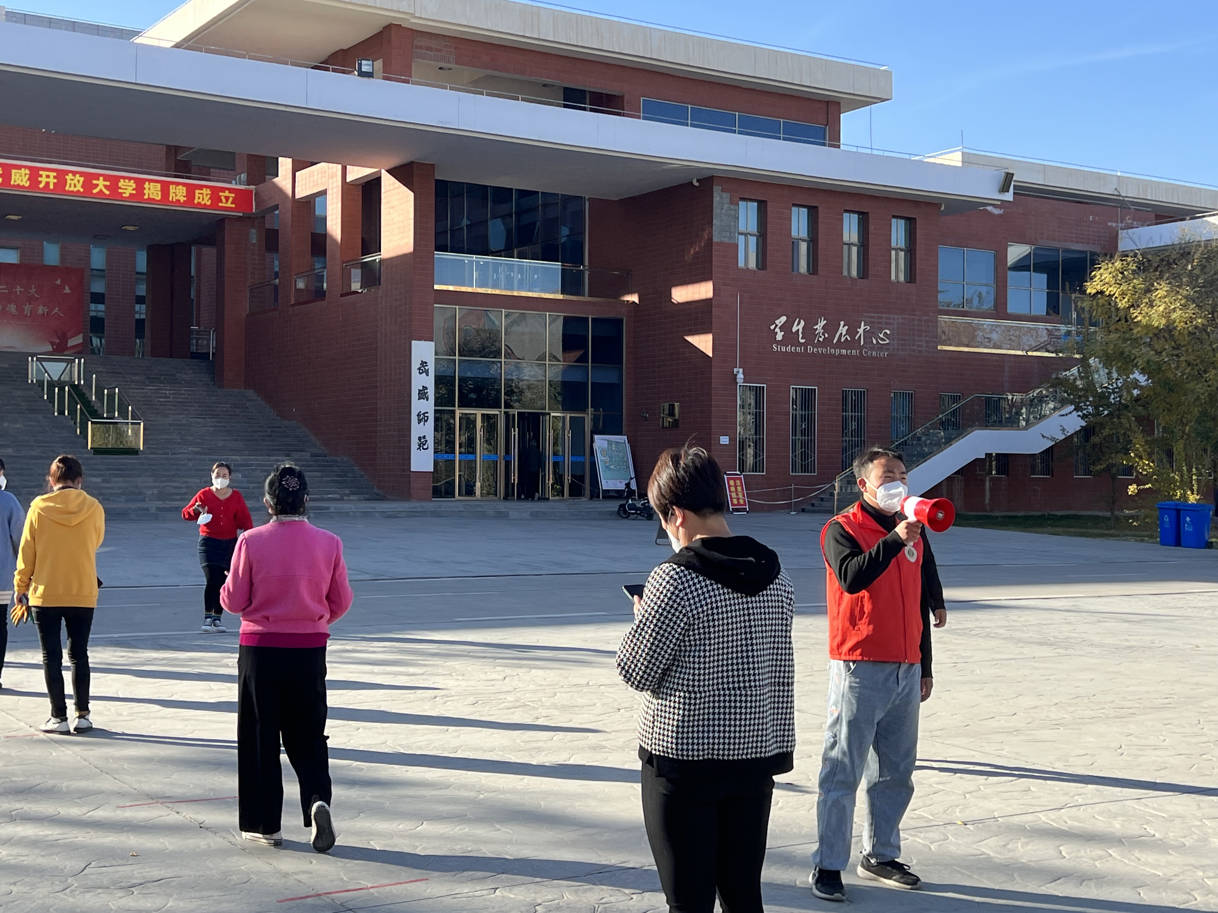“您好,請測量體溫、掃場所碼?!薄罢埮宕骱每谡郑行蚺抨牎毙W(xué)生會的陶玲在學(xué)校食堂門口值班時不停地提醒著進(jìn)出打飯的同學(xué)們,這也是她參加校園疫情防控以來每天講得最多的話。自10月13日涼州區(qū)實(shí)施臨時管控以來,學(xué)校各學(xué)生組織聞令而動,身穿“藍(lán)馬甲”積極投身校園疫情防控一線,用奉獻(xiàn)溫暖了這個秋天。